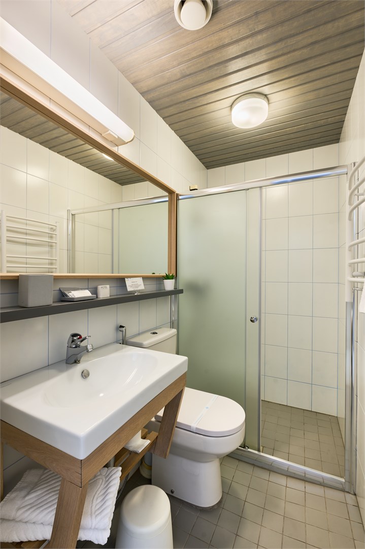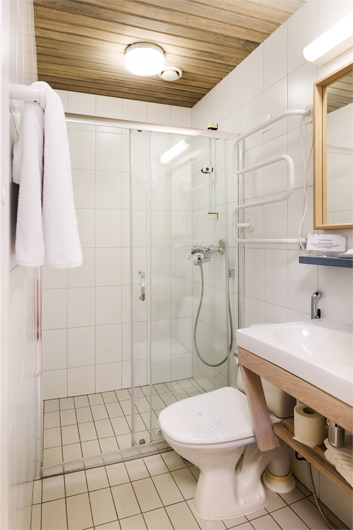 с душем: с сауной в номере; тапочки: ; туалетные принадлежности: ; фен: ; халат: ;