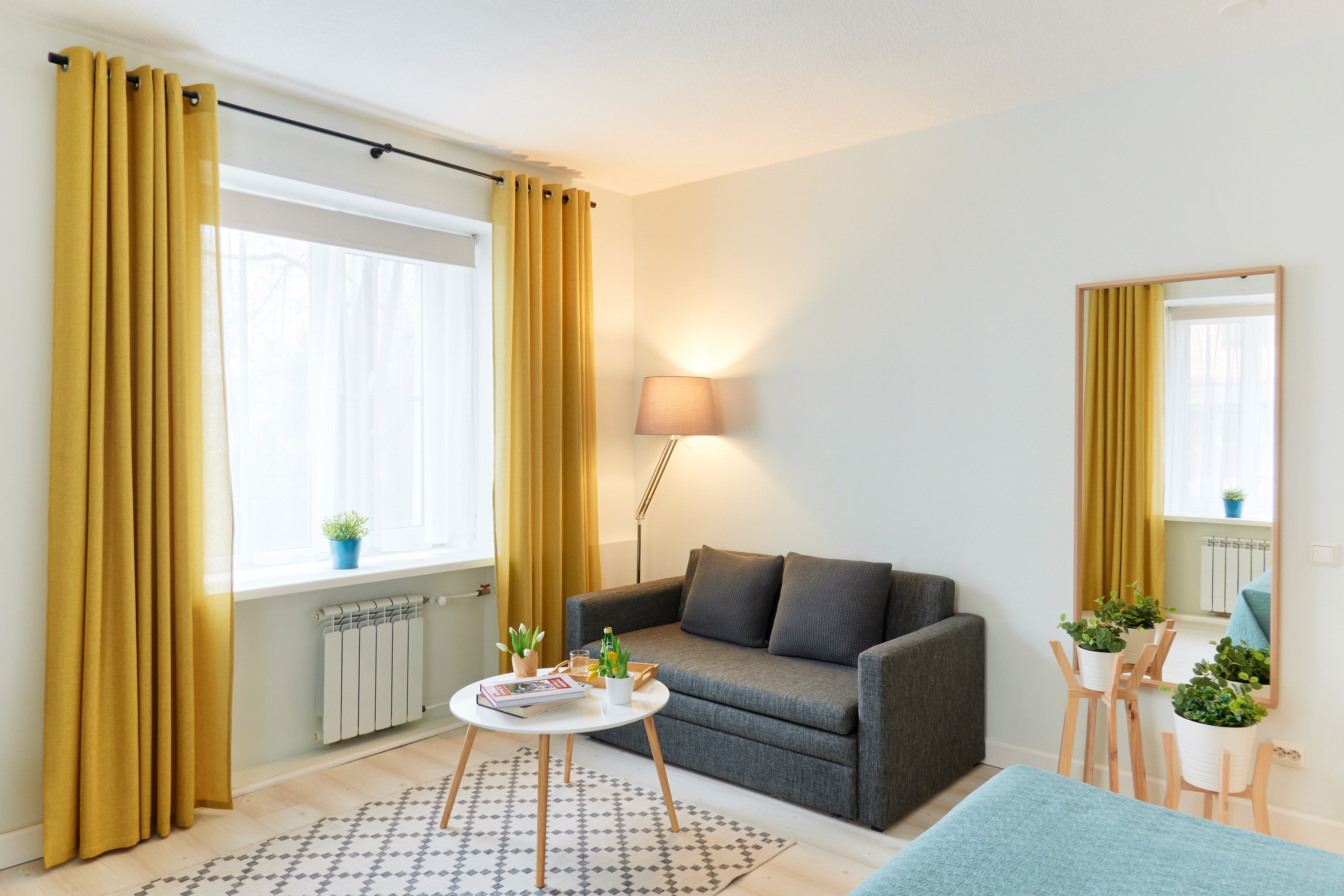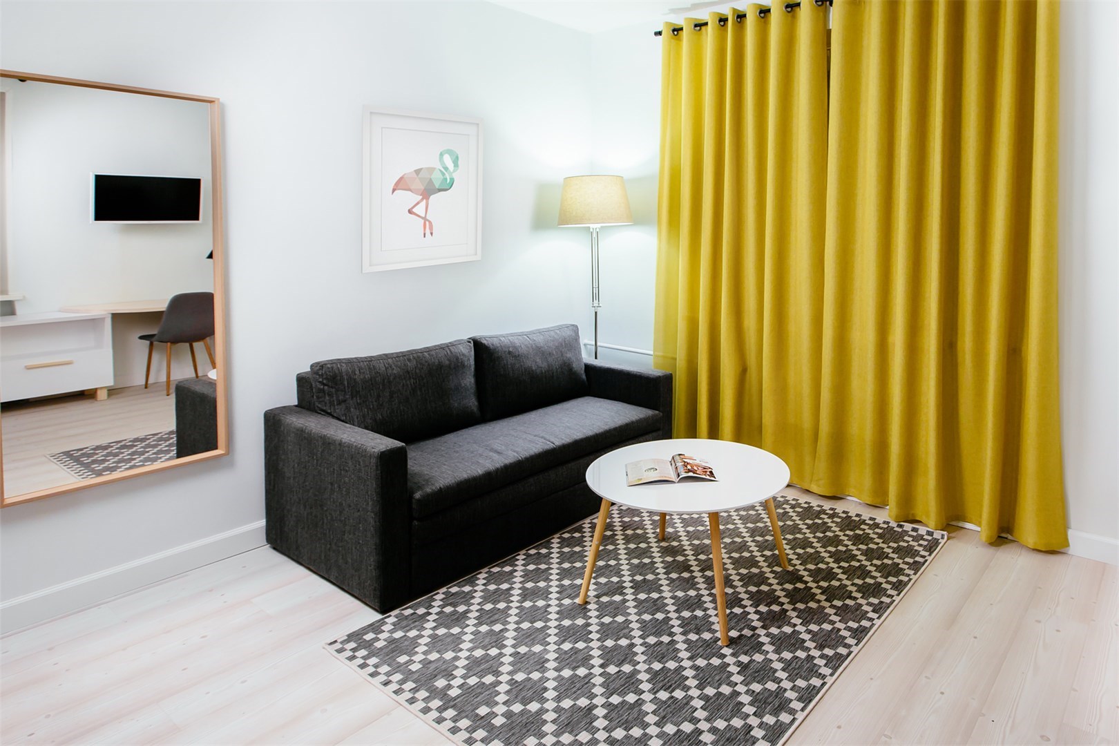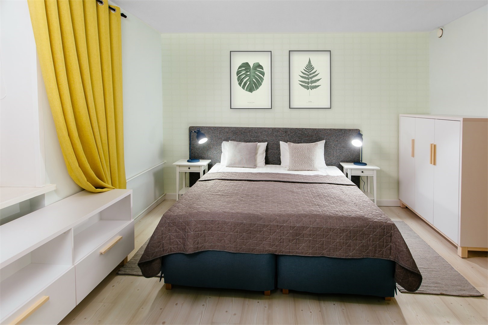 вешалка: ; диван раскладной: ; зеркало: ; кровати односпальные /одна двуспальная кровать: ; прикроватные тумбочки: ; стол для компьютера: ; столик журнальный: ; стол обеденный: ; стулья: ; шкаф: ;