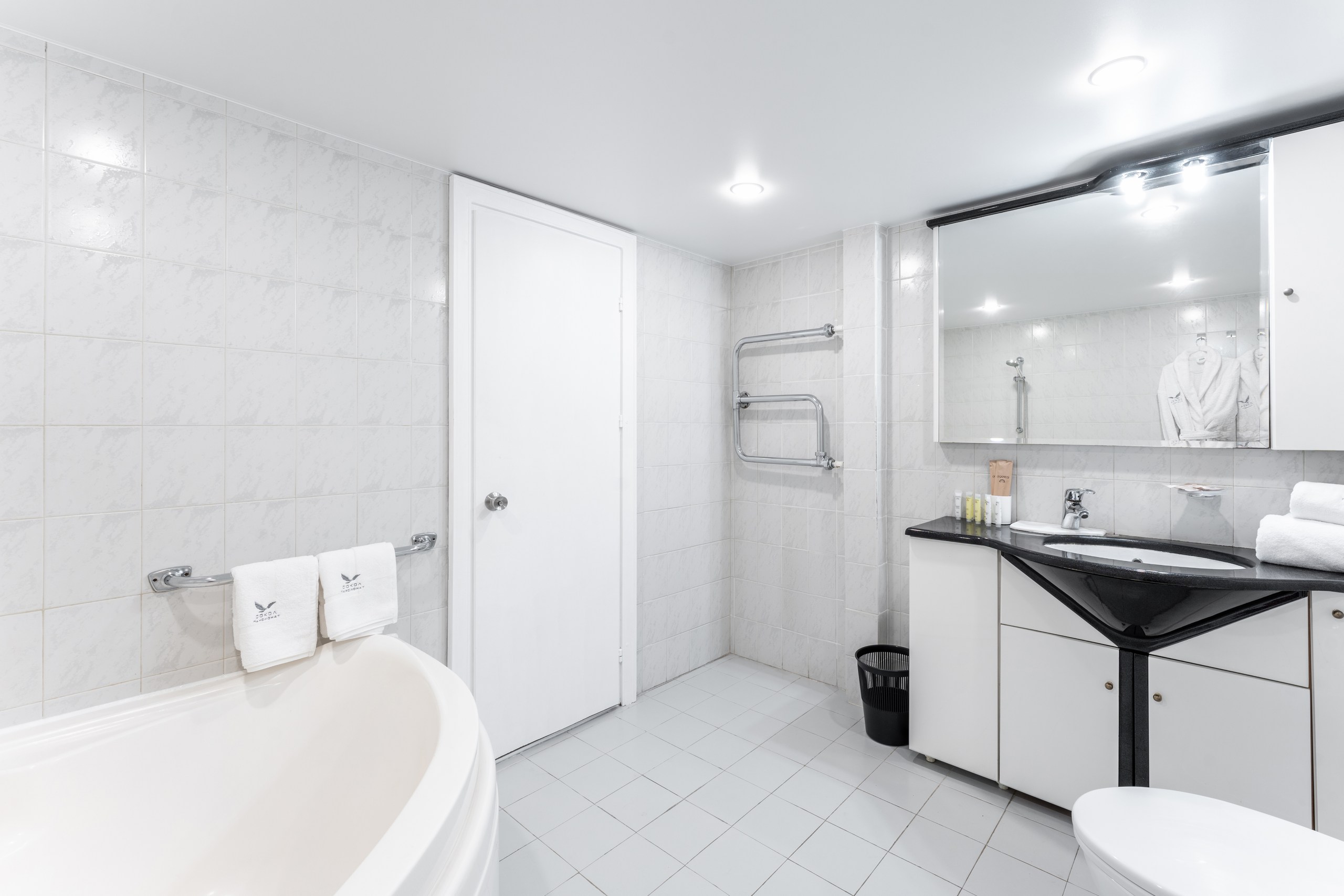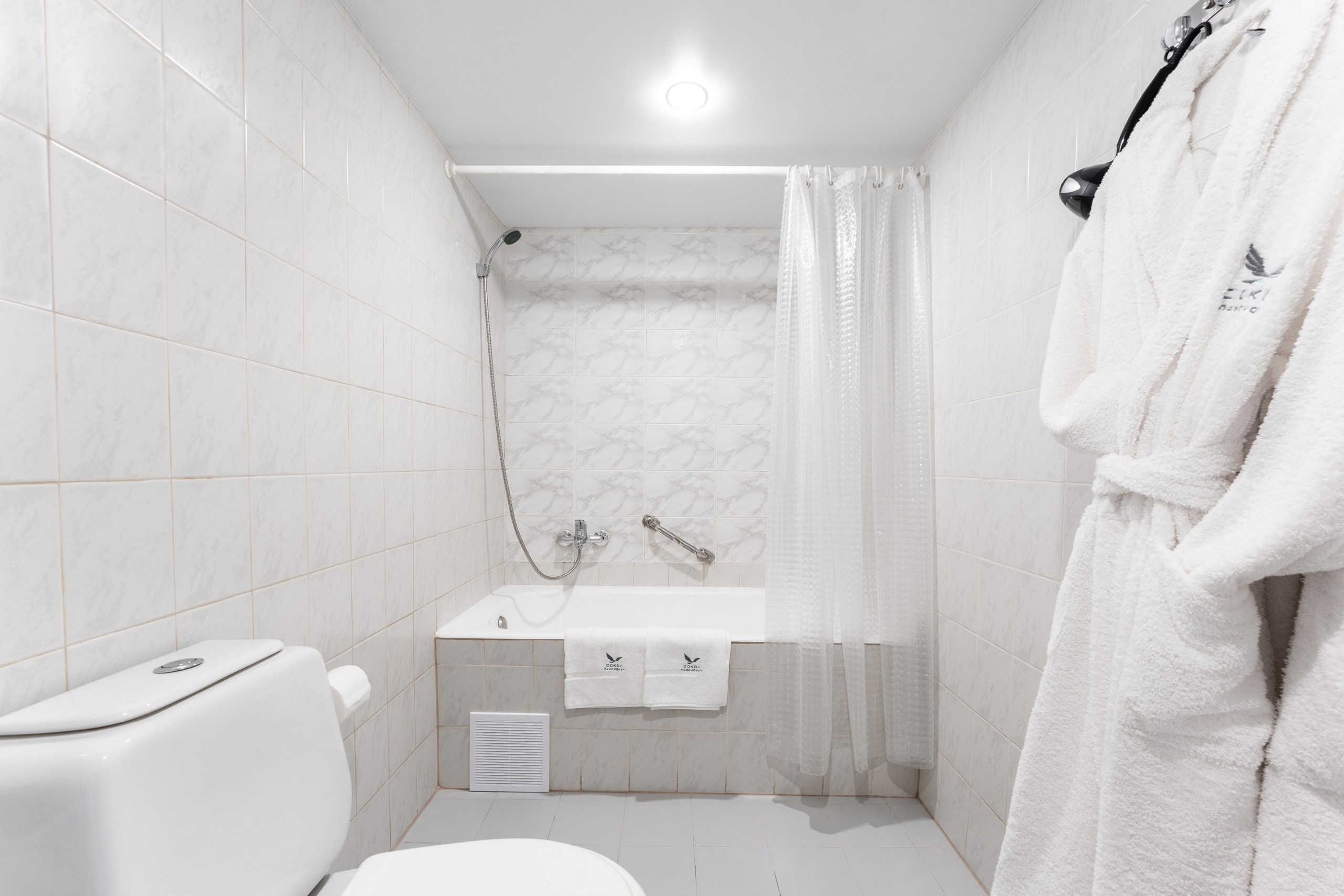 с ванной: ; тапочки: ; туалетные принадлежности: ; фен: ; халат: ;