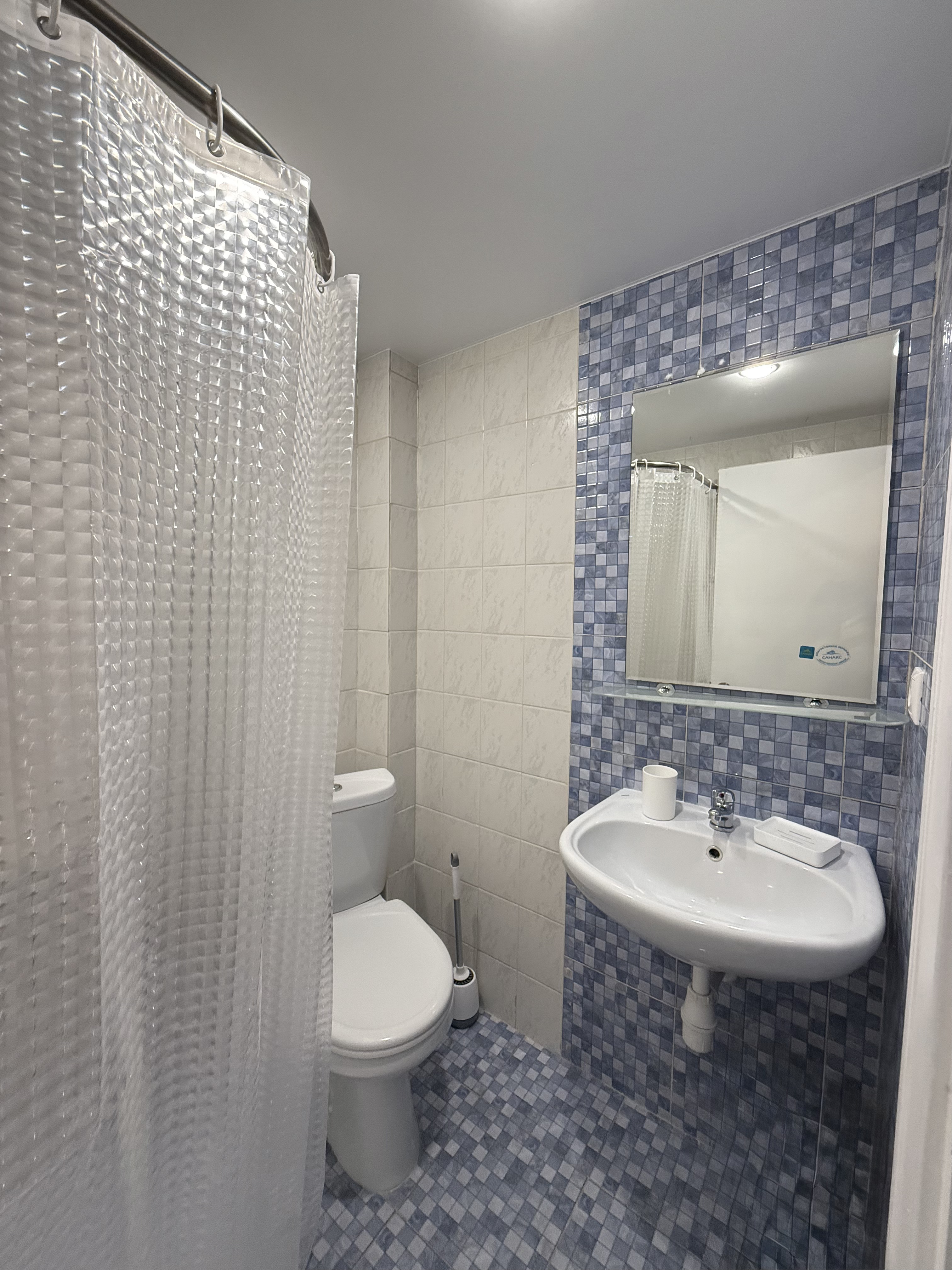 с душем: ; тапочки: ; туалетные принадлежности: ; фен: ; халат: ;