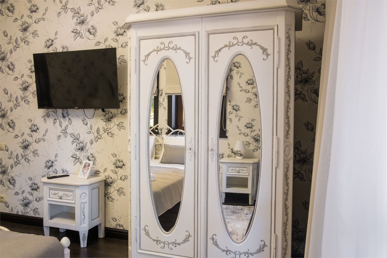 зеркало: ; кровати односпальные /одна двуспальная кровать: ; прикроватные тумбочки: ; пуфик: ; стол: ; шкаф: ;