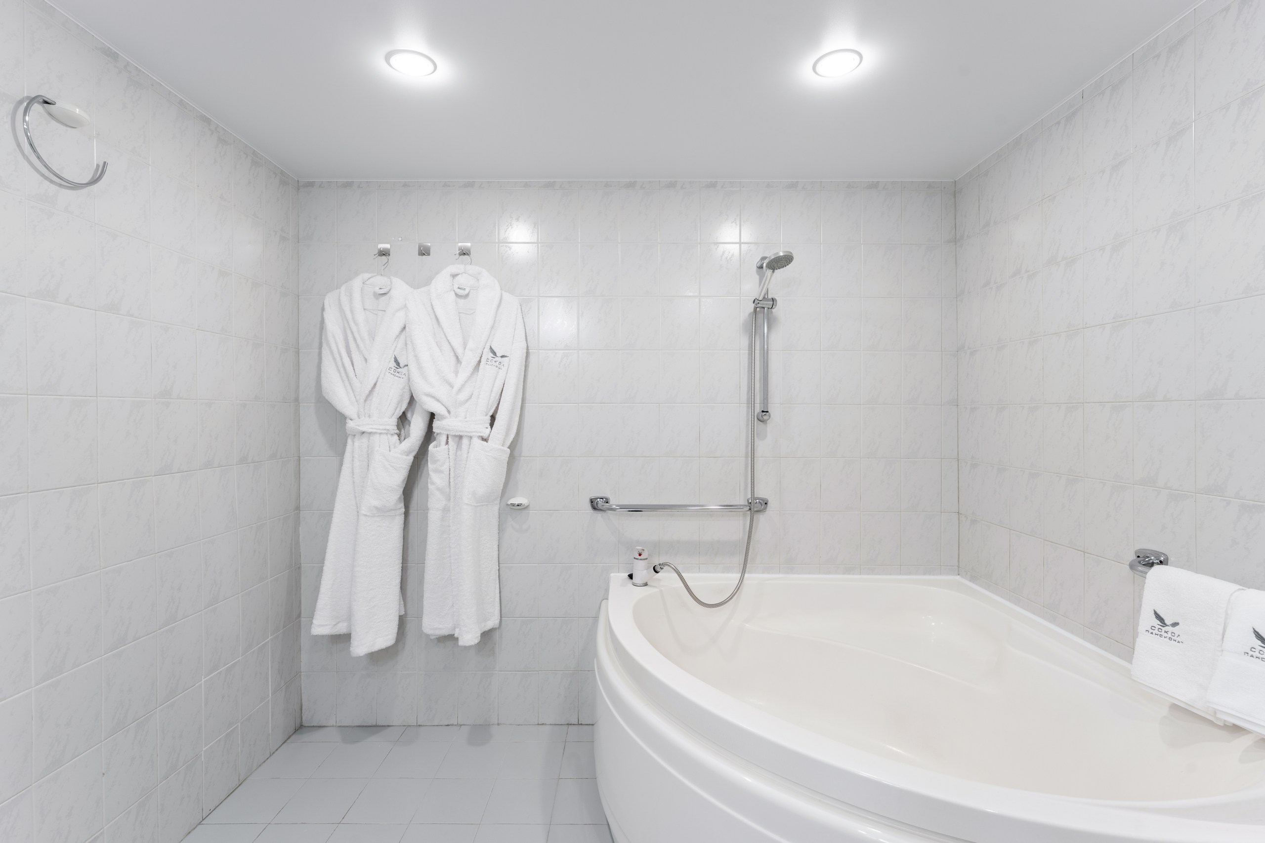 с душевой кабиной: ; тапочки: ; туалетные принадлежности: ; фен: ; халат: ;
