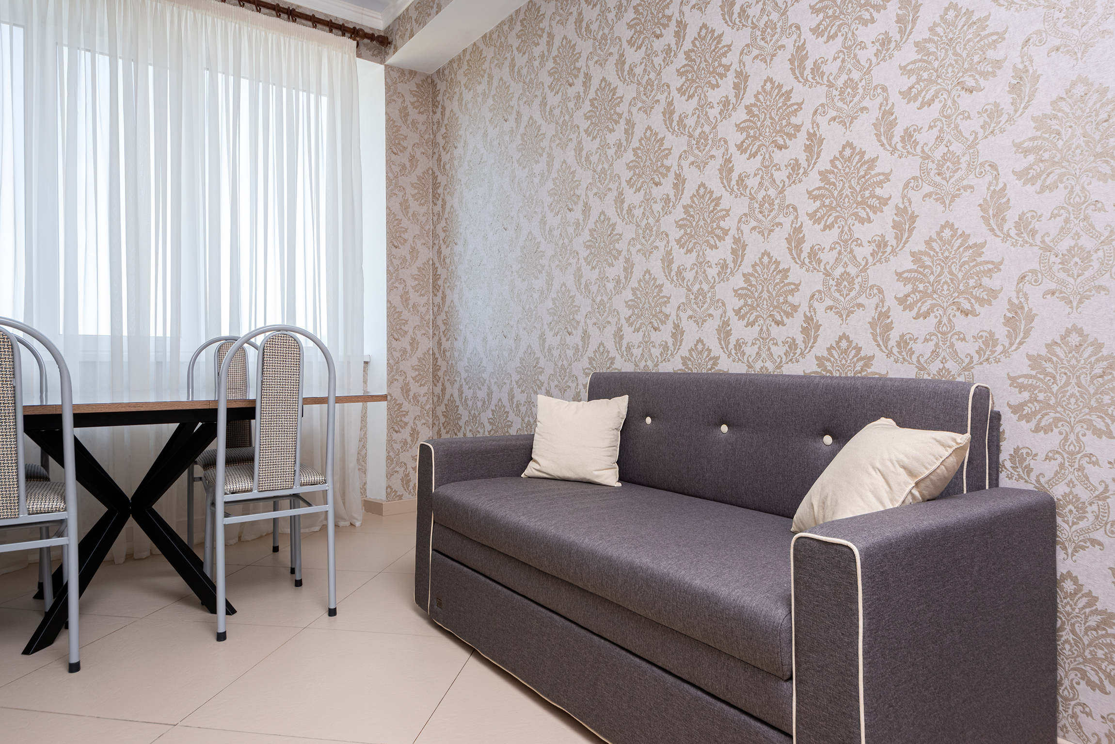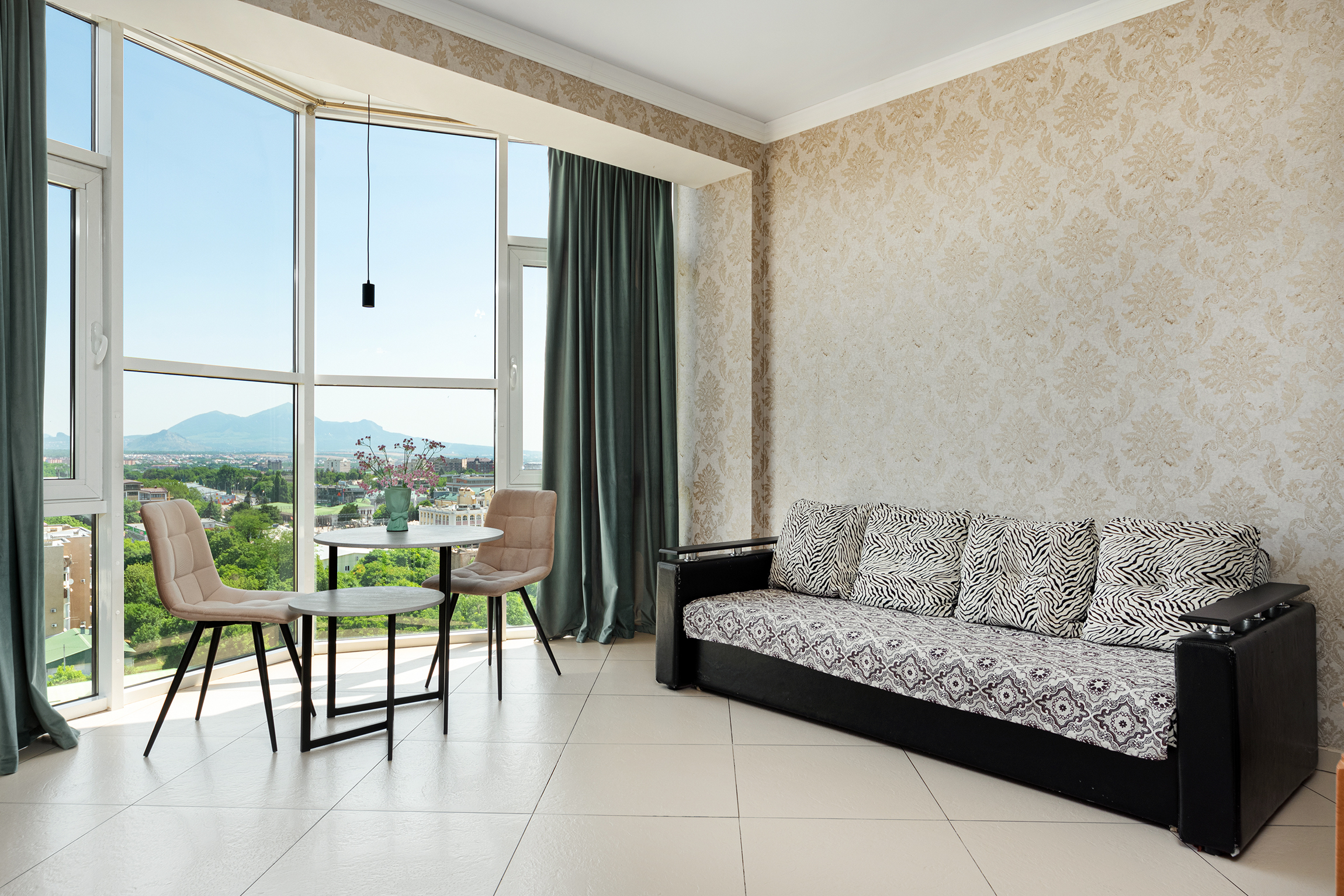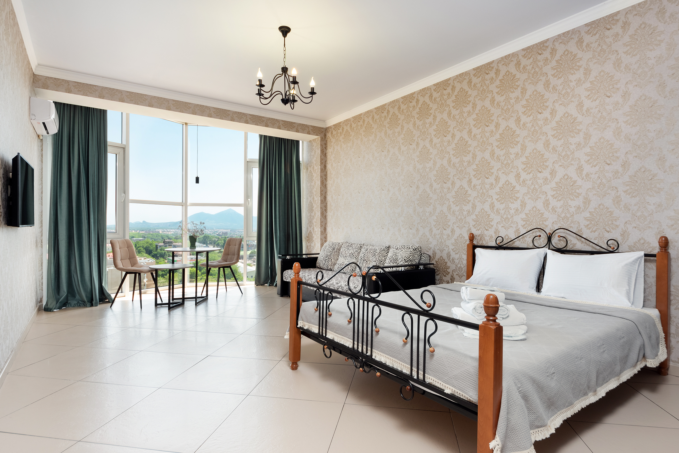 Внутреннее пространство создано для глубокого отдыха и расслабления. Его сердцем является широкая двуспальная кровать с ортопедическим матрасом, которая гарантирует восстанавливающий сон. Особой гордостью служит зона отдыха с панорамным видом, открывающим перспективу на город и живописные предгорья — идеальное место для утреннего кофе или вечерних размышлений. Просторная и технически оснащенная кухня позволяет с легкостью готовить любимые блюда, а продуманные детали вроде фена, утюга и сушилки для белья делают пребывание по-настоящему комфортным. Бесперебойный Wi-Fi, телевидение и кондиционер дополняют картину заботы о госте. Для путешествующих на личном транспорте рядом предусмотрена общественная парковка.