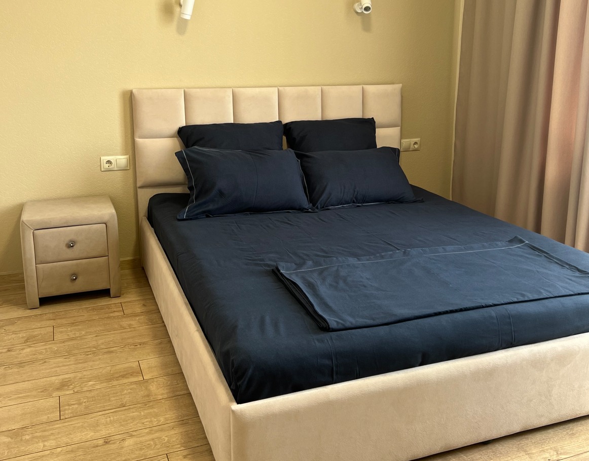 вешалка: ; зеркало: ; кровать двуспальная: ; прикроватные тумбочки: ; стол: ; стулья: ; шкаф: ;