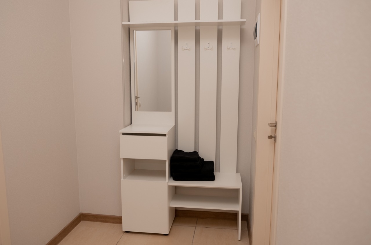 вешалка: ; зеркало: ; кровати односпальные: ; кровать двуспальная: ; прикроватные тумбочки: ; стол: ; стулья: ; шкаф: ;
