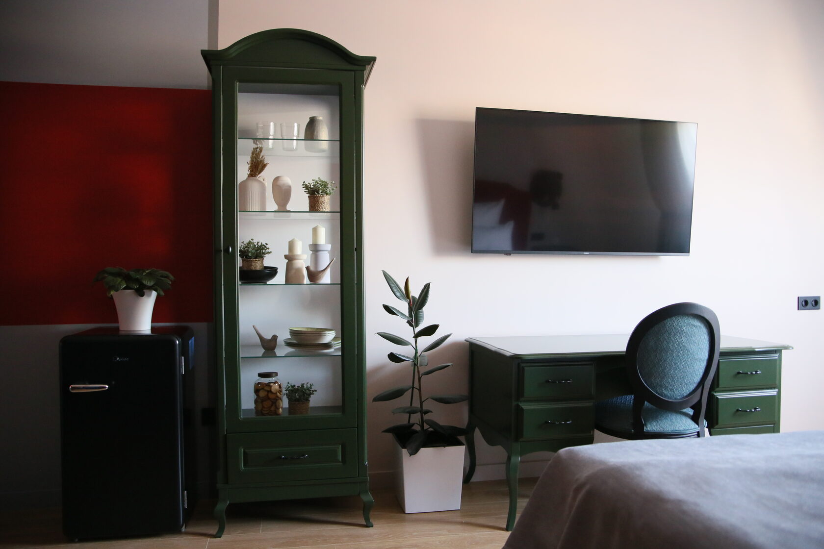 вешалка: ; зеркало: ; кровать двуспальная: ; прикроватные тумбочки: ; стол: ; шкаф: ;