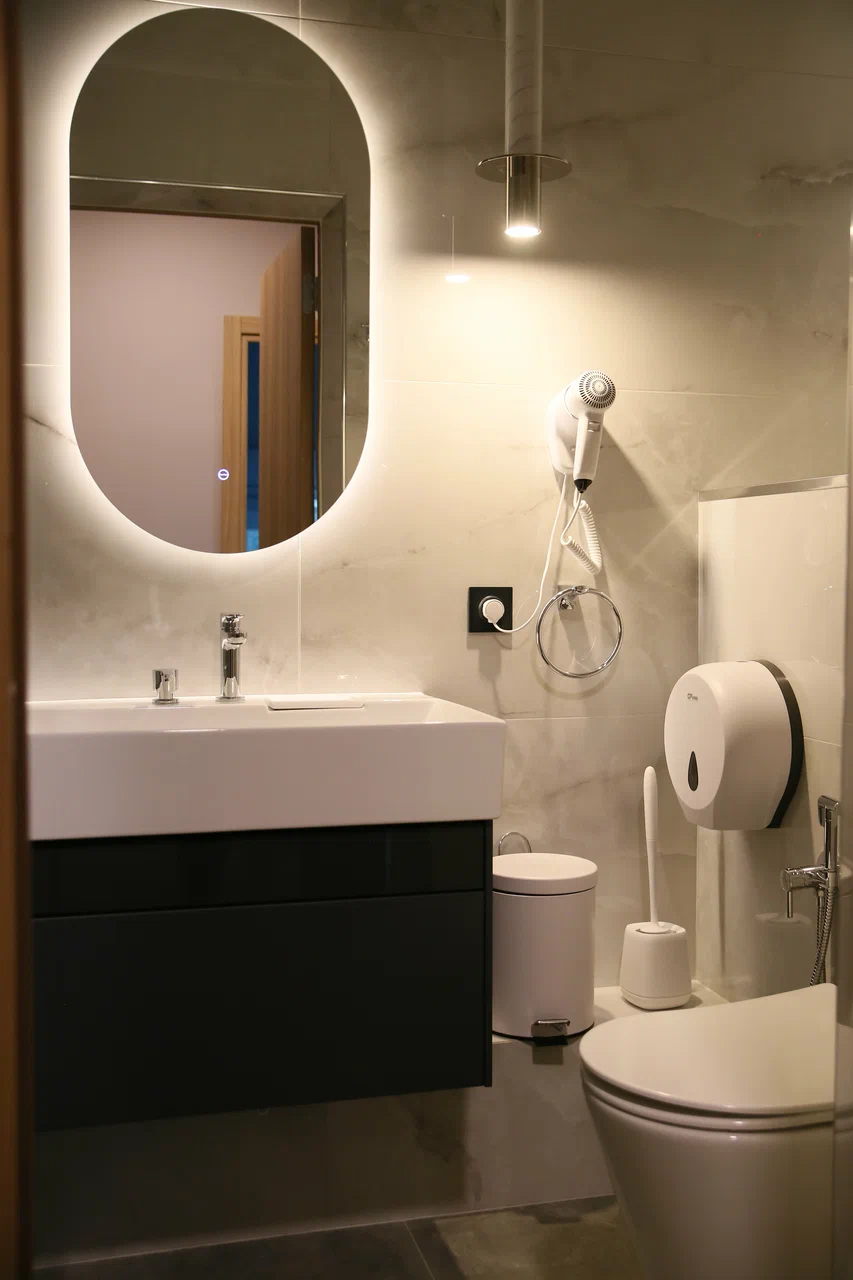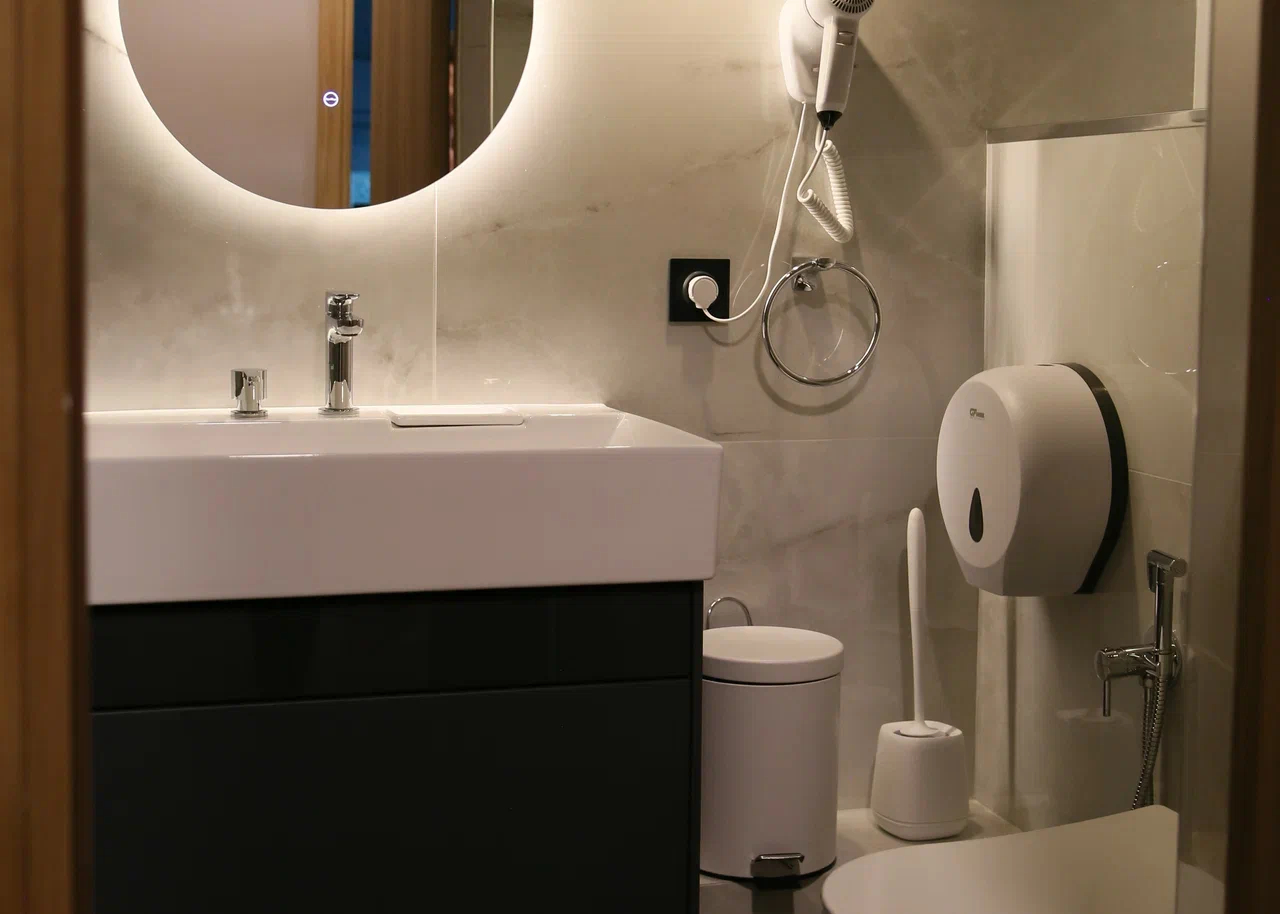 с душем: ; туалетные принадлежности: ; фен: ;