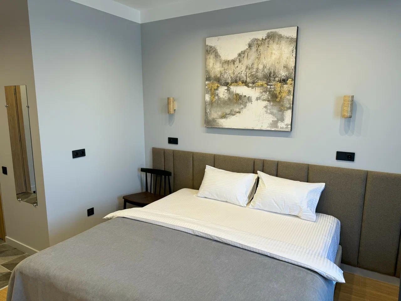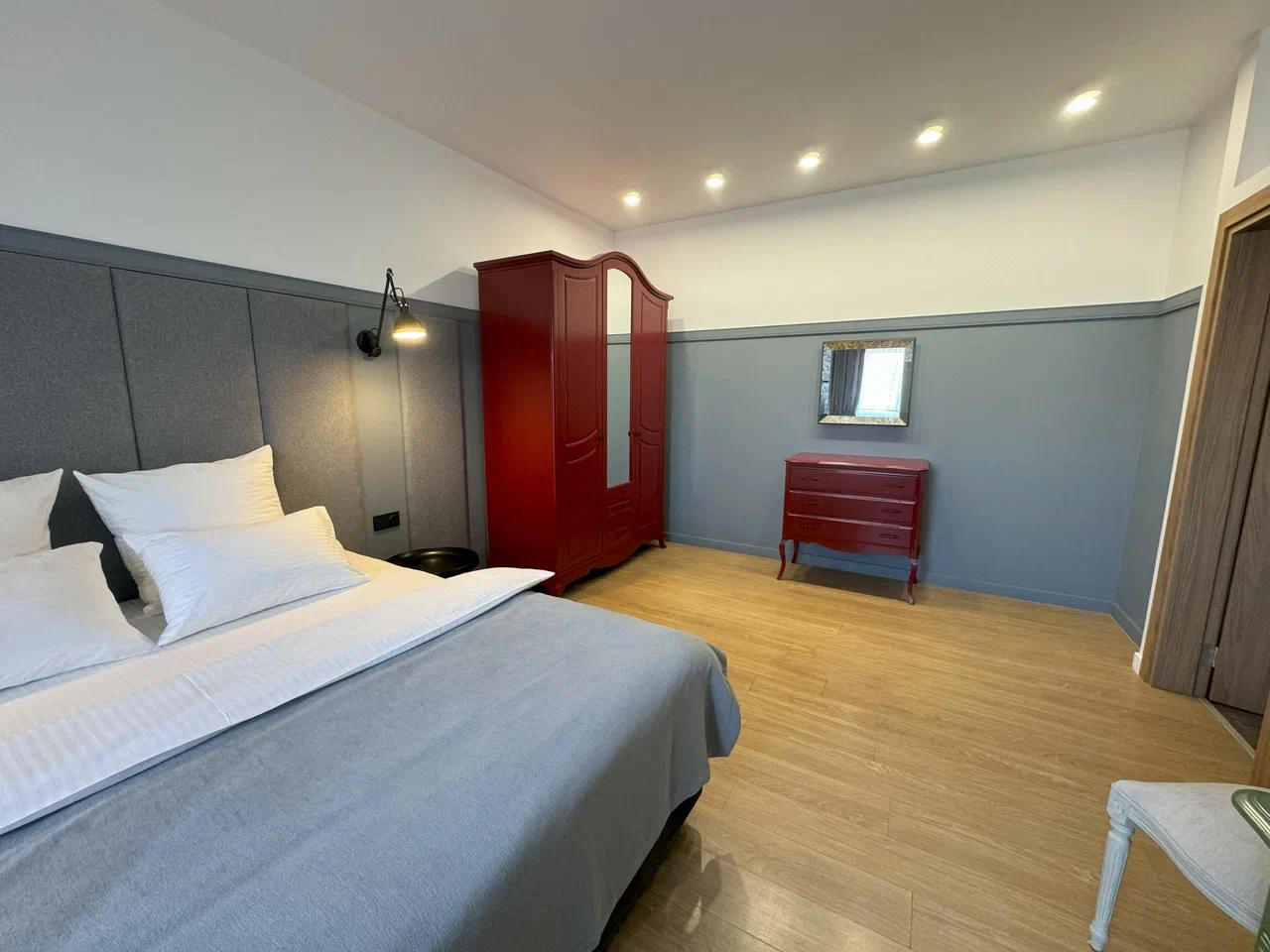 вешалка: ; зеркало: ; кресло-кровать: ; кровать двуспальная: ; прикроватные тумбочки: ; стол: ; стулья: ; шкаф: ;