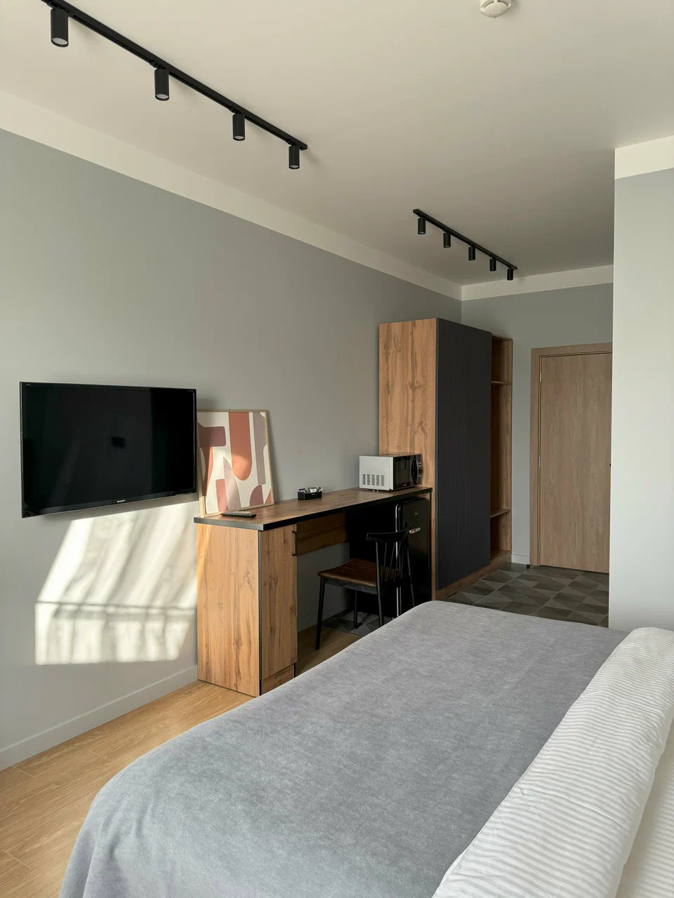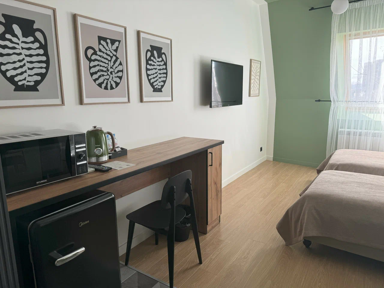 микроволновая печь: ; мини-холодильник: ; телевизор: ; чайный набор посуды: ; электрочайник: ;