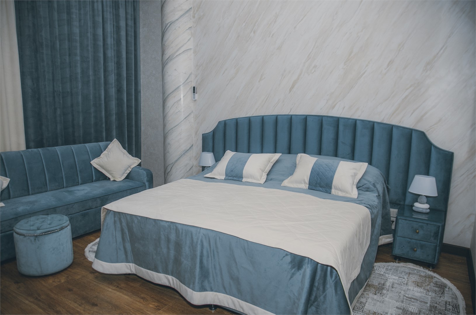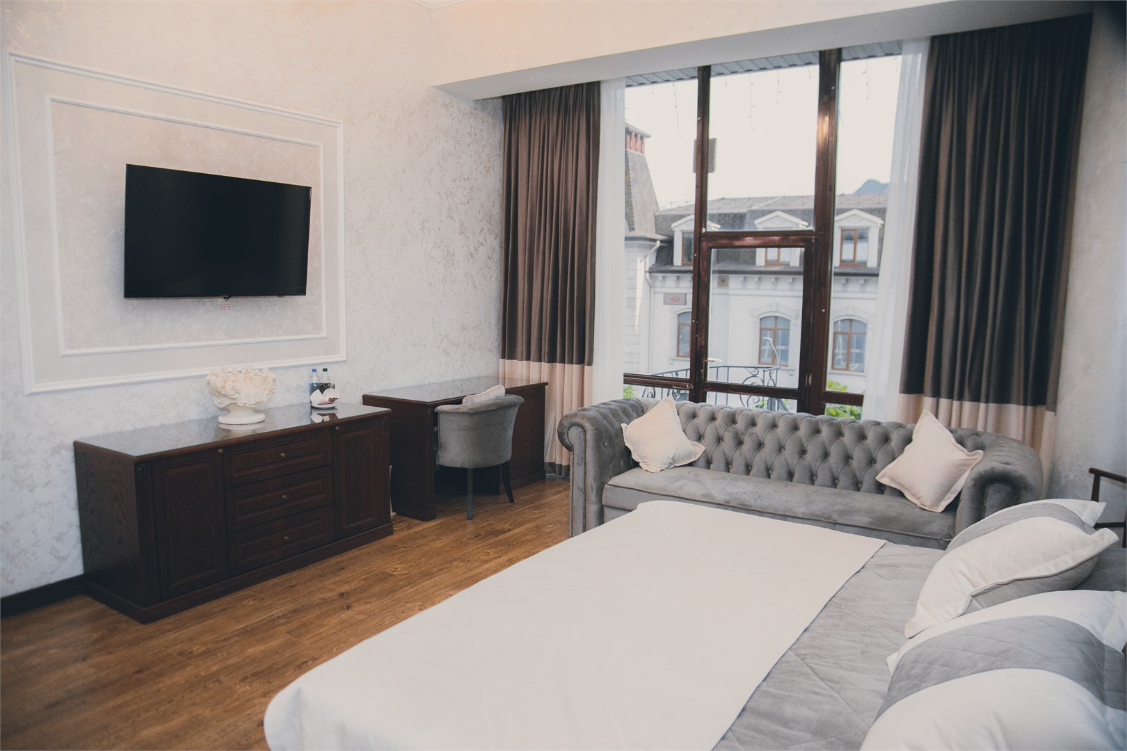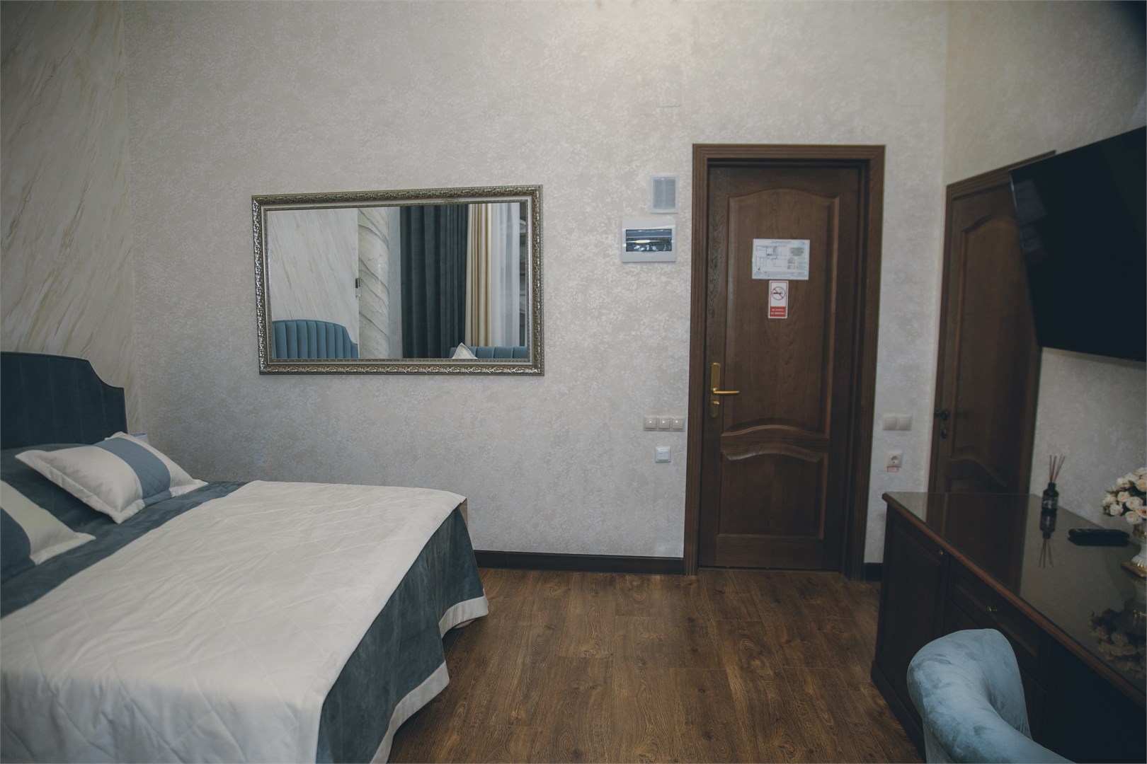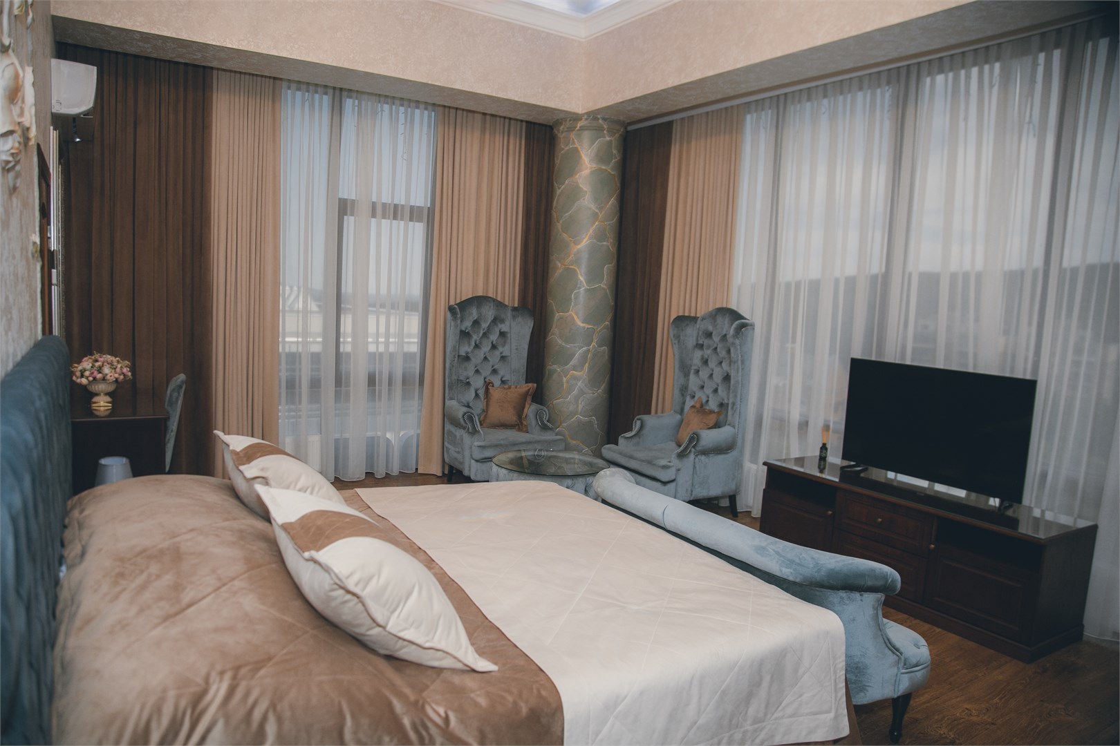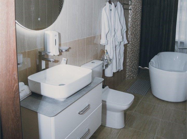 Гости могут остановиться в номерах разных категорий. Интерьеры оформлены в спокойных нейтральных тонах, меблировка современная и функциональная?— в комнатах есть удобные кровати, диваны, кондиционер, телевизор, мини?бар и сейф. В санузлах — душевая кабина, фен, тапочки и гигиенические средства, а подогрев полов позволяет комфортно чувствовать себя при любой погоде.