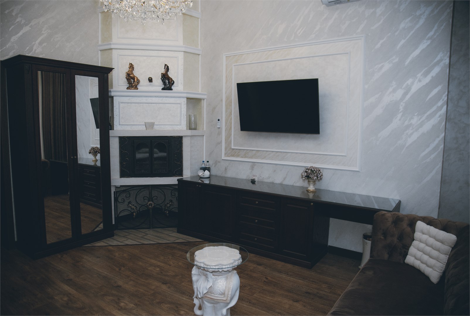 вешалка: ; диван: ; зеркало: ; кровать двуспальная: ; прикроватные тумбочки: ; стол: ; стул: ; шкаф: ;