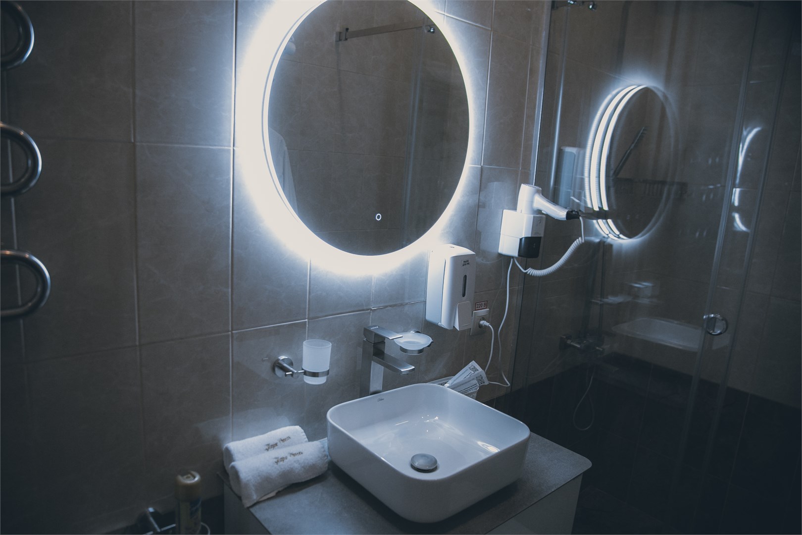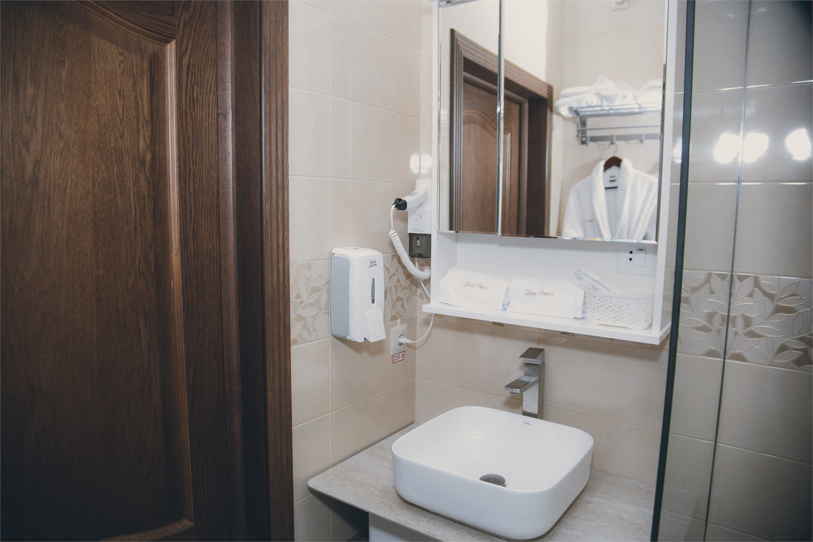 с душем: ; туалетные принадлежности: ; фен: ;