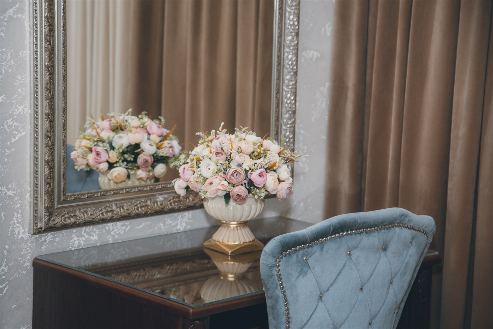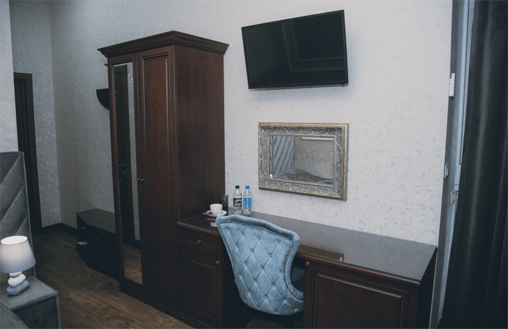 вешалка: ; зеркало: ; кровать двуспальная: ; прикроватные тумбочки: ; стол: ; стул: ; шкаф: ;