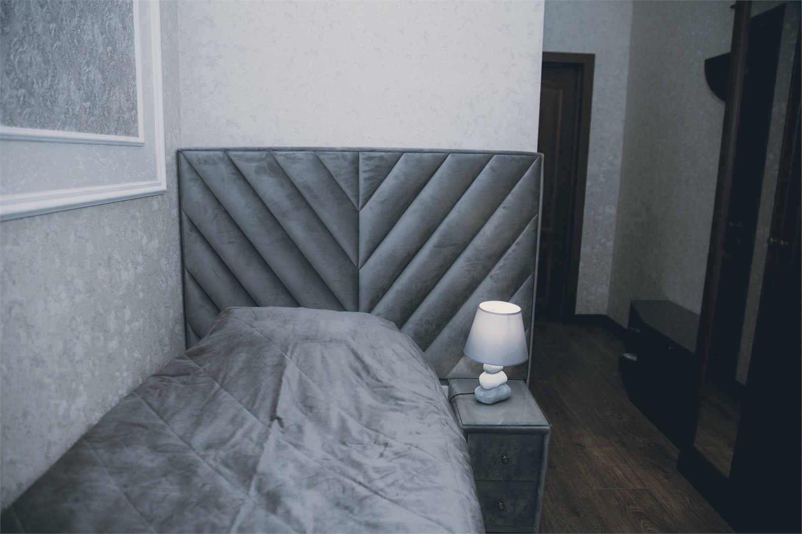 вешалка: ; зеркало: ; кровать односпальная: ; прикроватная тумбочка: ; стол: ; стул: ; шкаф: ;