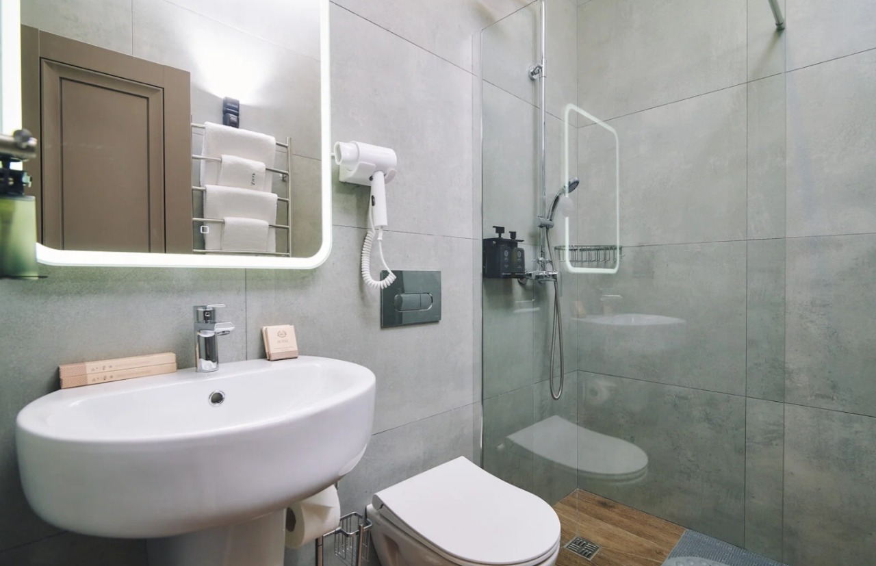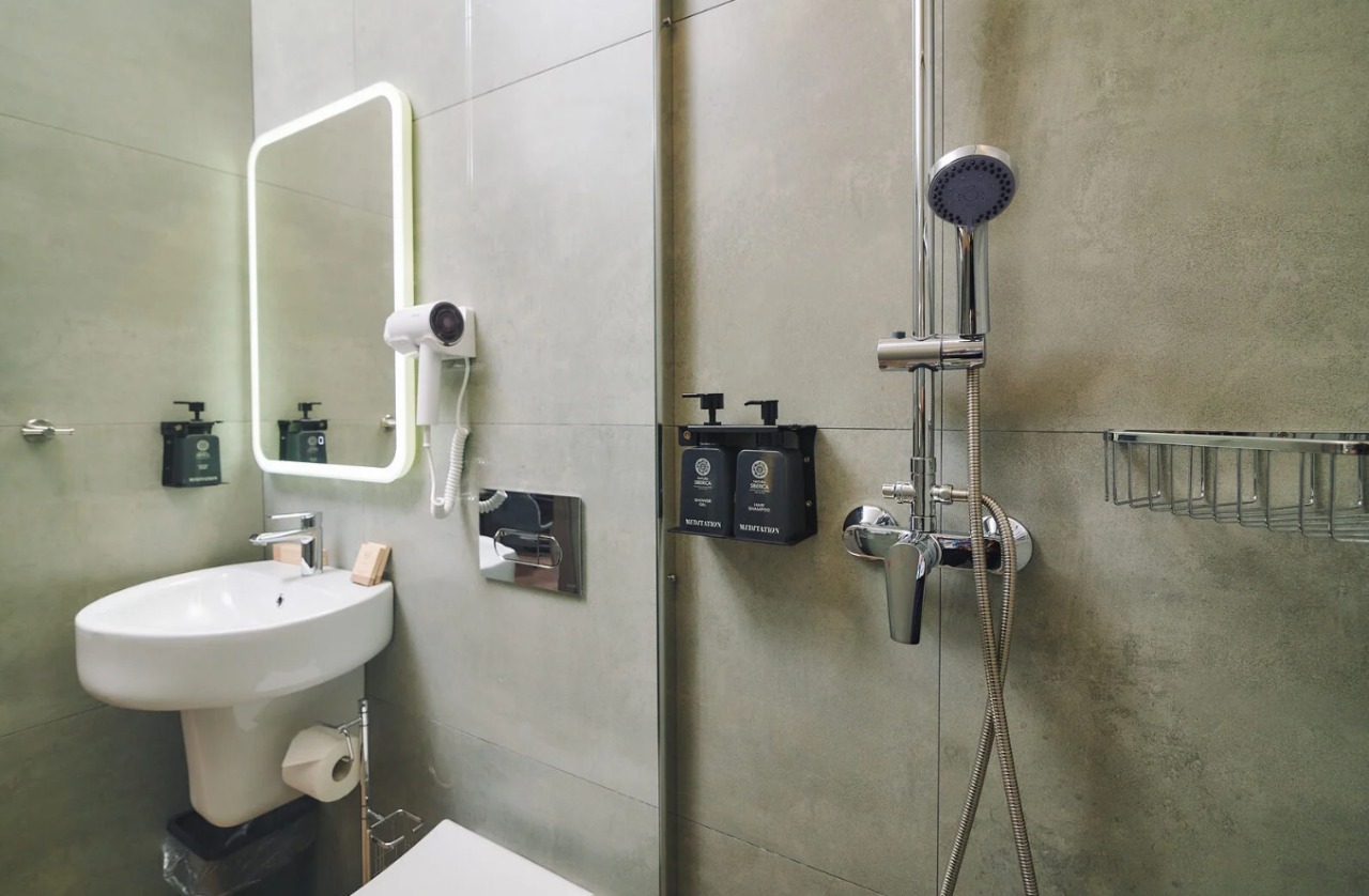 с душевой кабиной: ; туалетные принадлежности: ; фен: ;