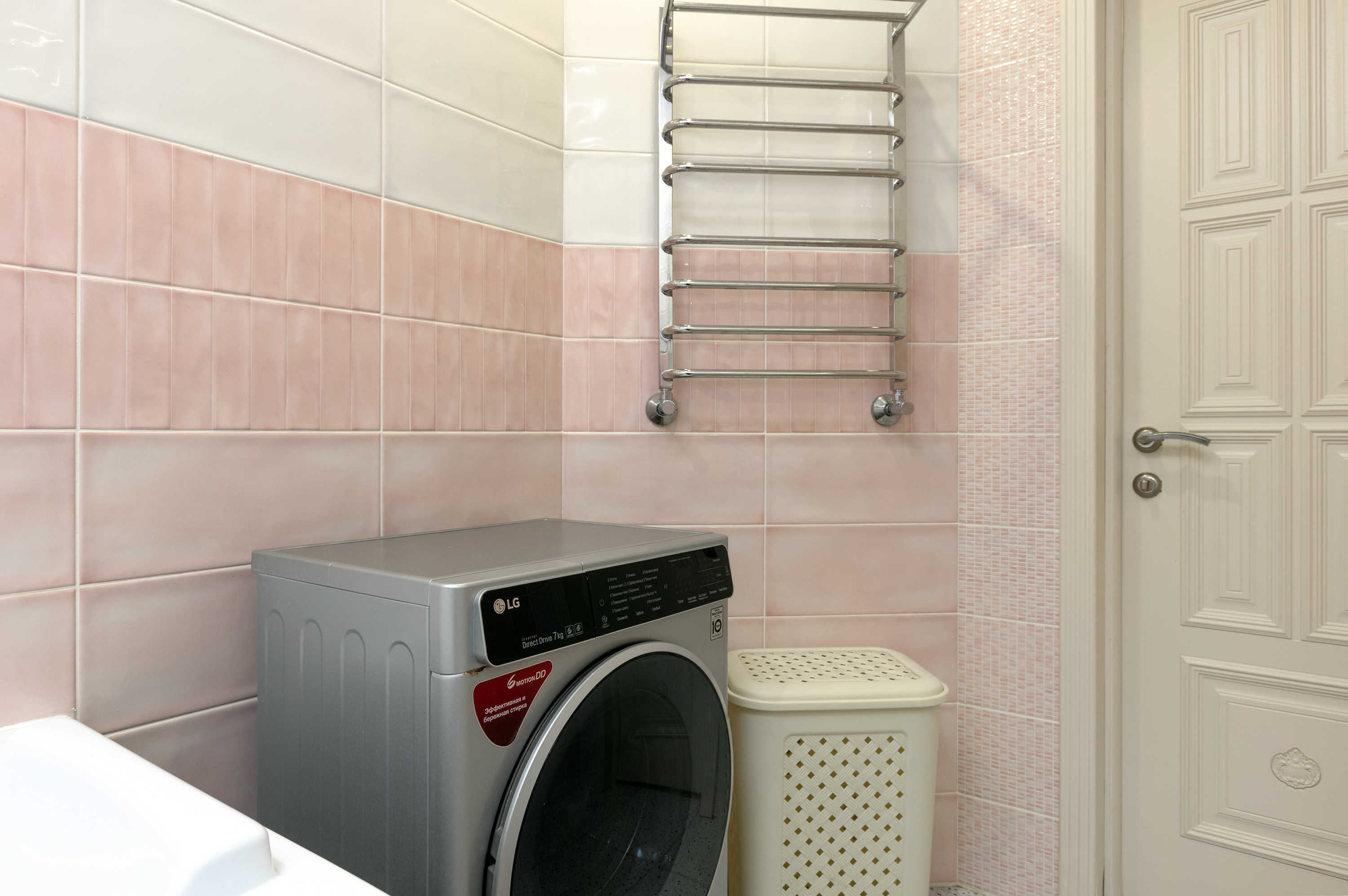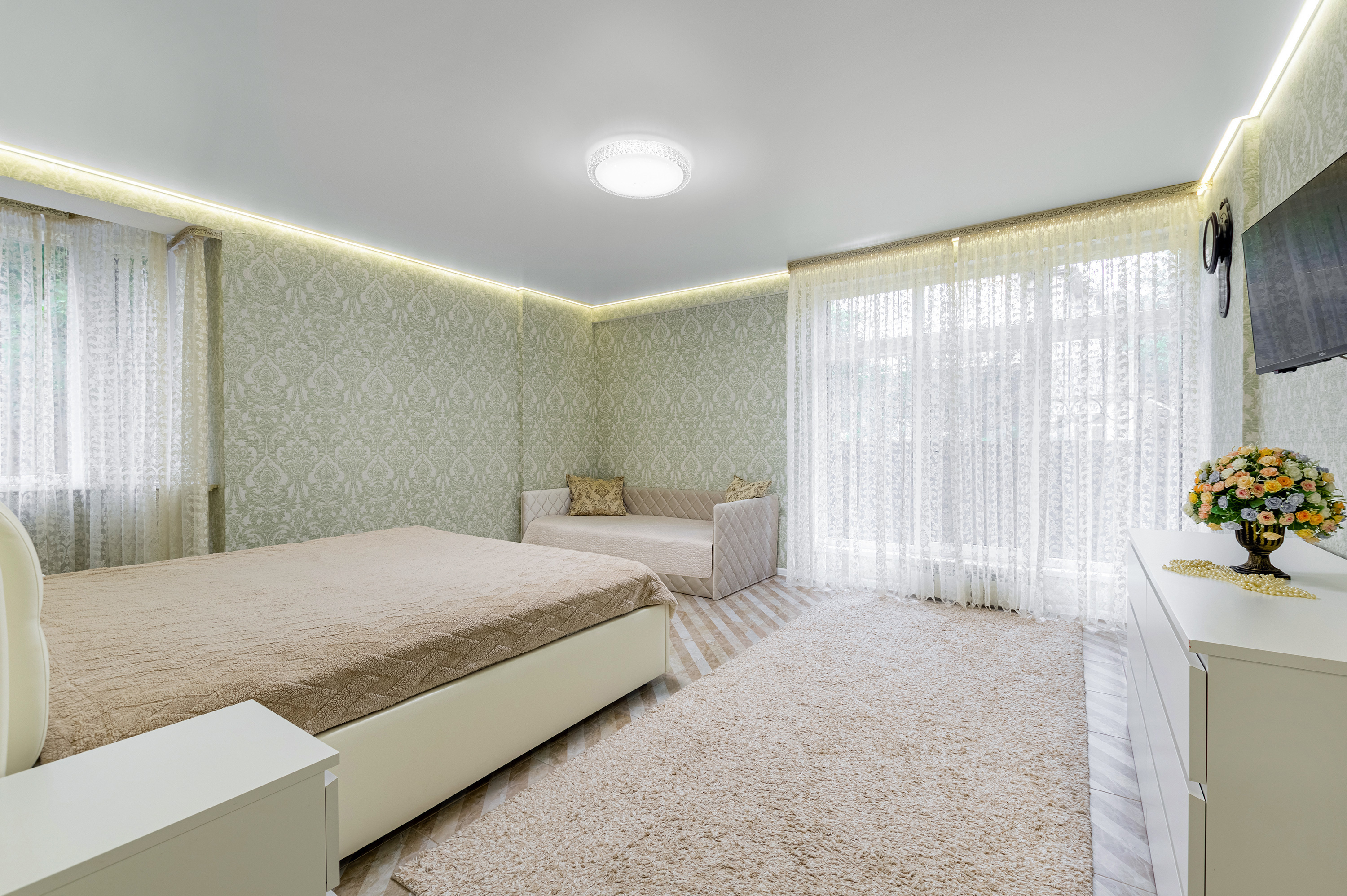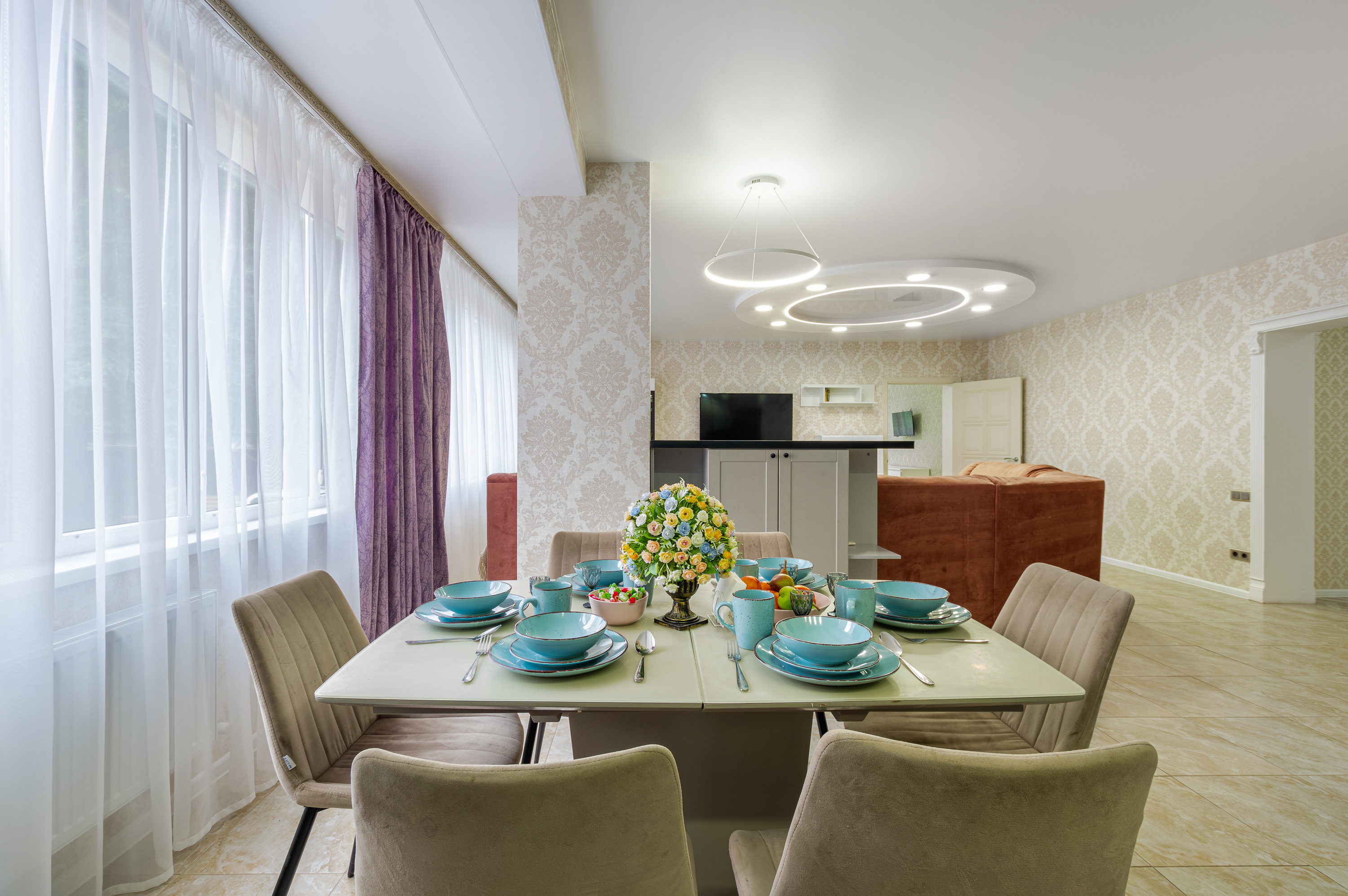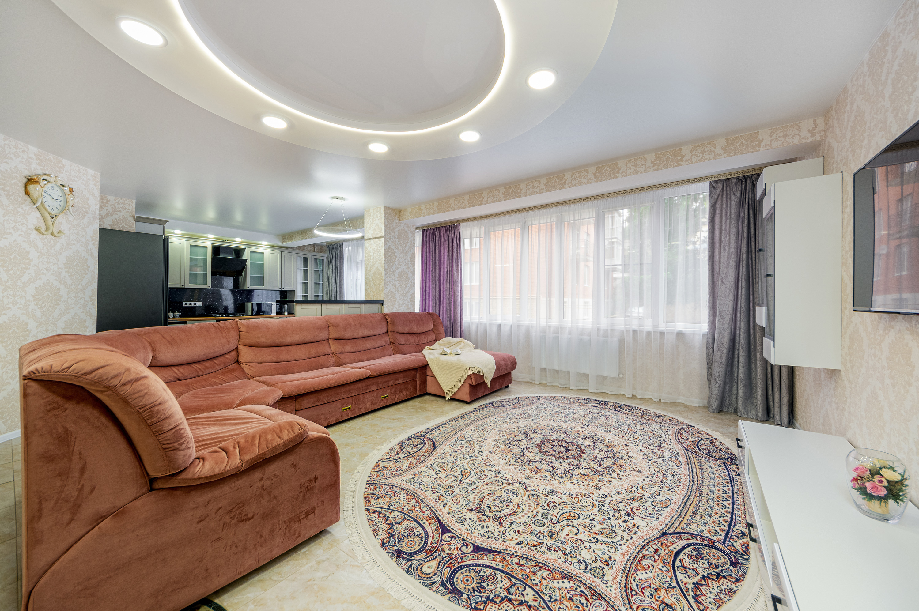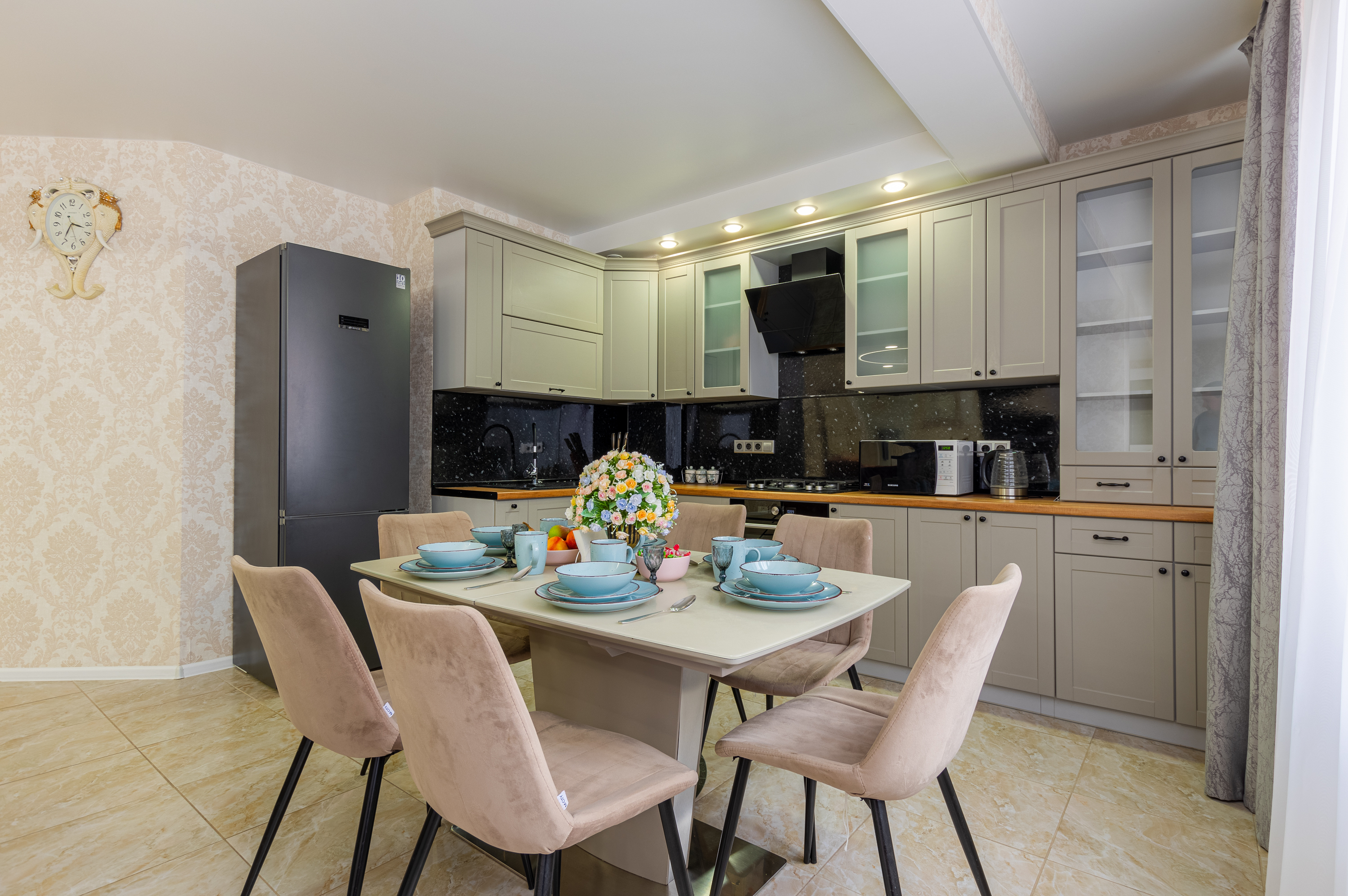 Просторные двухкомнатные апартаменты площадью 88 квадратных метров рассчитаны на комфортное размещение четырёх человек. В спальне установлена двуспальная кровать с прикроватными тумбочками, в гостиной — удобный диван. В каждой комнате есть телевизор, а на всей территории доступен беспроводной Wi-Fi. Кухня полностью оборудована для самостоятельного приготовления пищи: газовая плита с духовым шкафом, холодильник, микроволновая печь, электрочайник и полный набор посуды. Для бытовых нужд предусмотрены стиральная машина, утюг с гладильной доской.