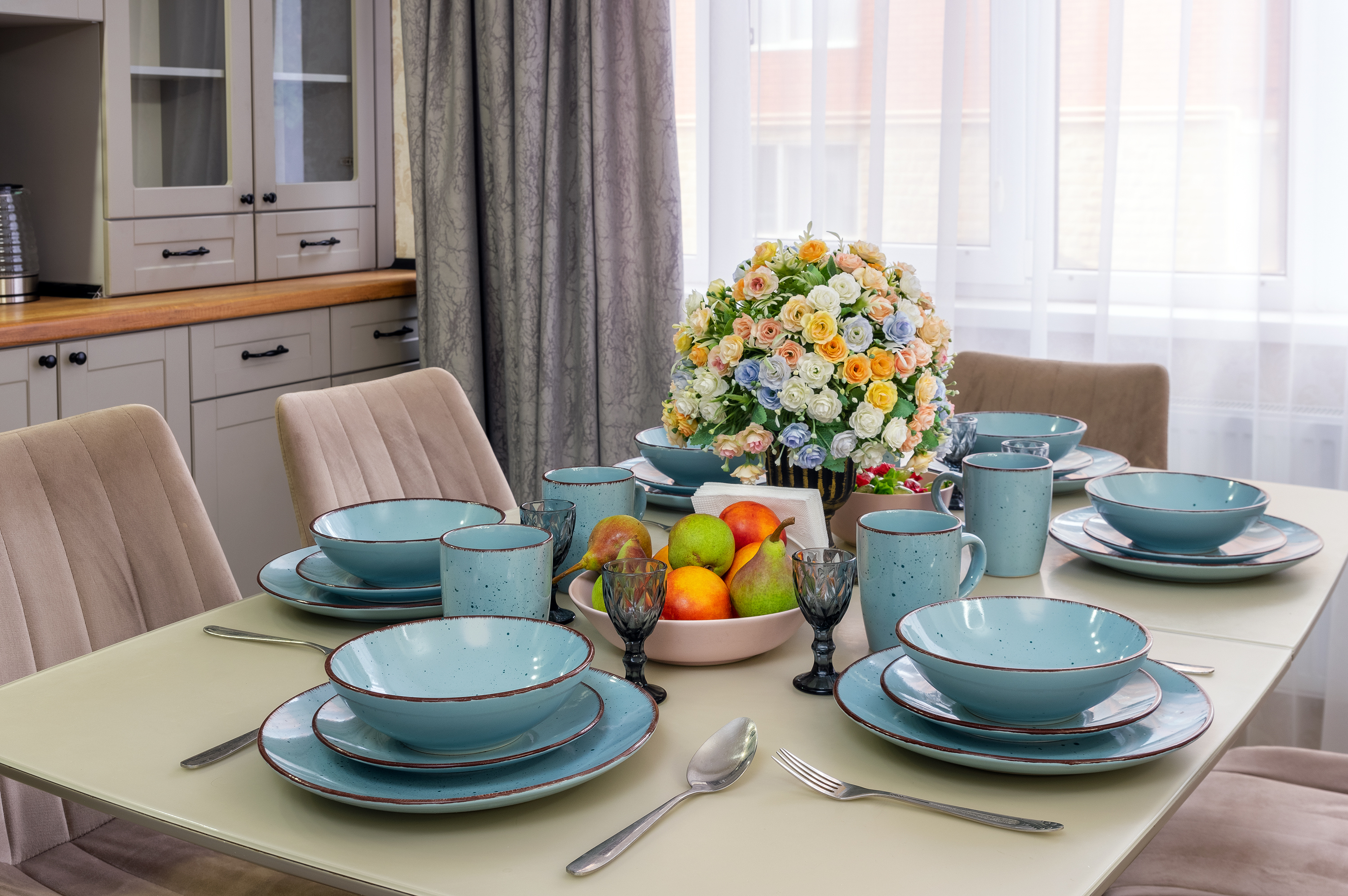 гладильная доска: ; духовой шкаф: ; микроволновая печь: ; набор посуды: ; плита газовая: ; стиральная машина: ; телевизор: ; умная колонка: ; утюг: ; холодильник: ; электрочайник: ;