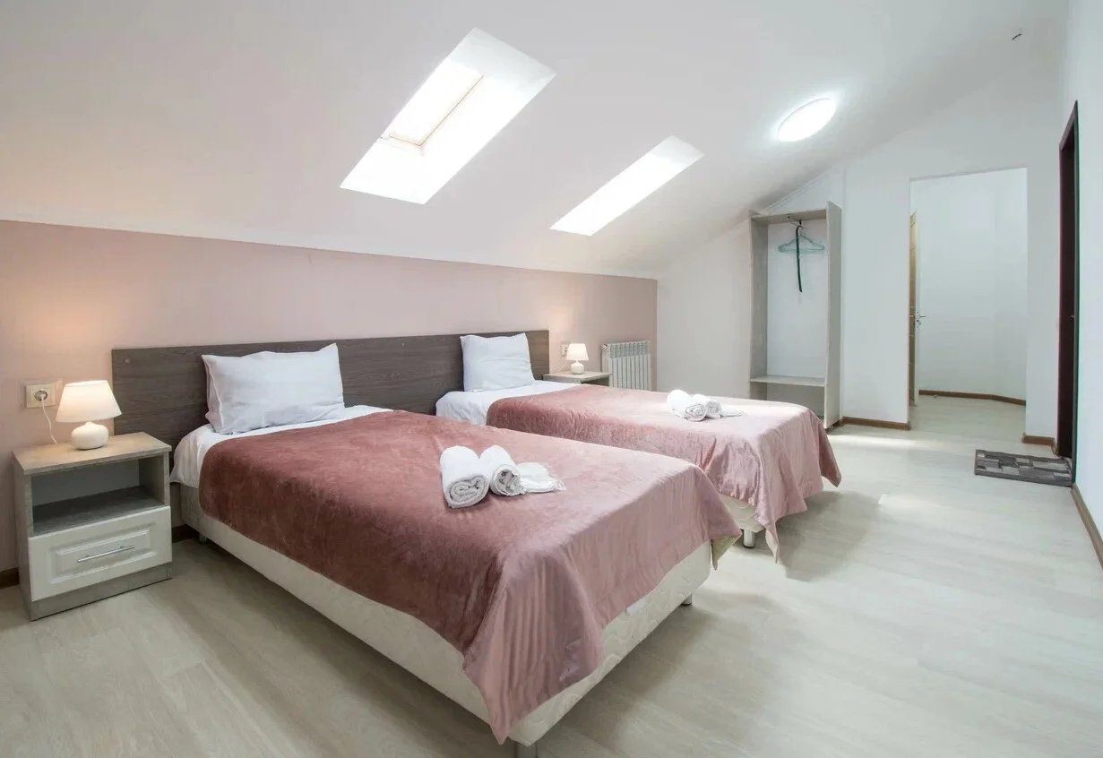 Отель занимает трехэтажный коттедж с большим закрытым двором. Жилой фонд включает просторные номера, полностью меблированные и подготовленные к приезду постояльцев. Каждая комната располагает двуспальной кроватью, телевизором, местами для хранения вещей, отдельным санузлом с встроенной душевой. Постояльцам доступно подключение к беспроводному интернету.
