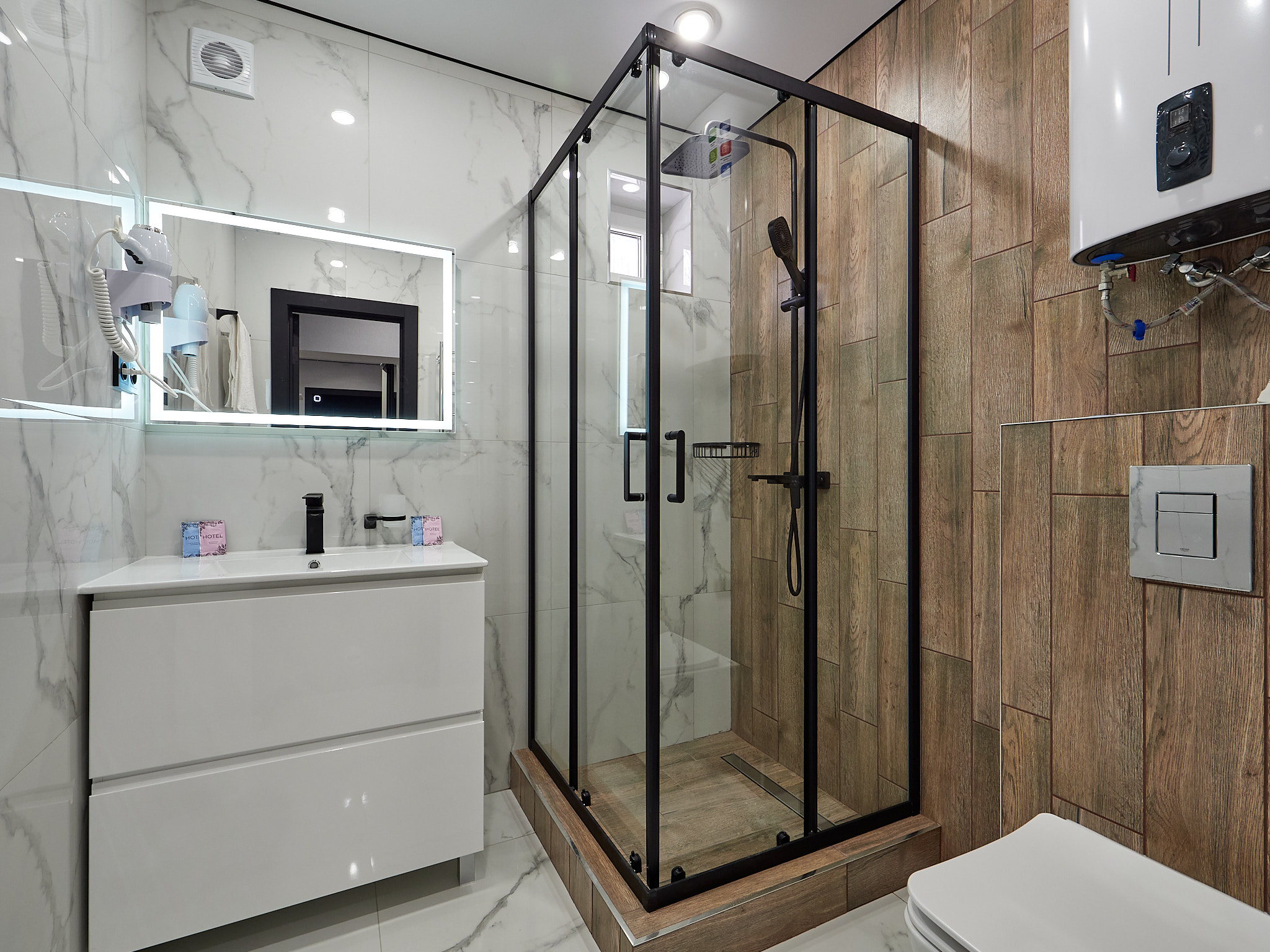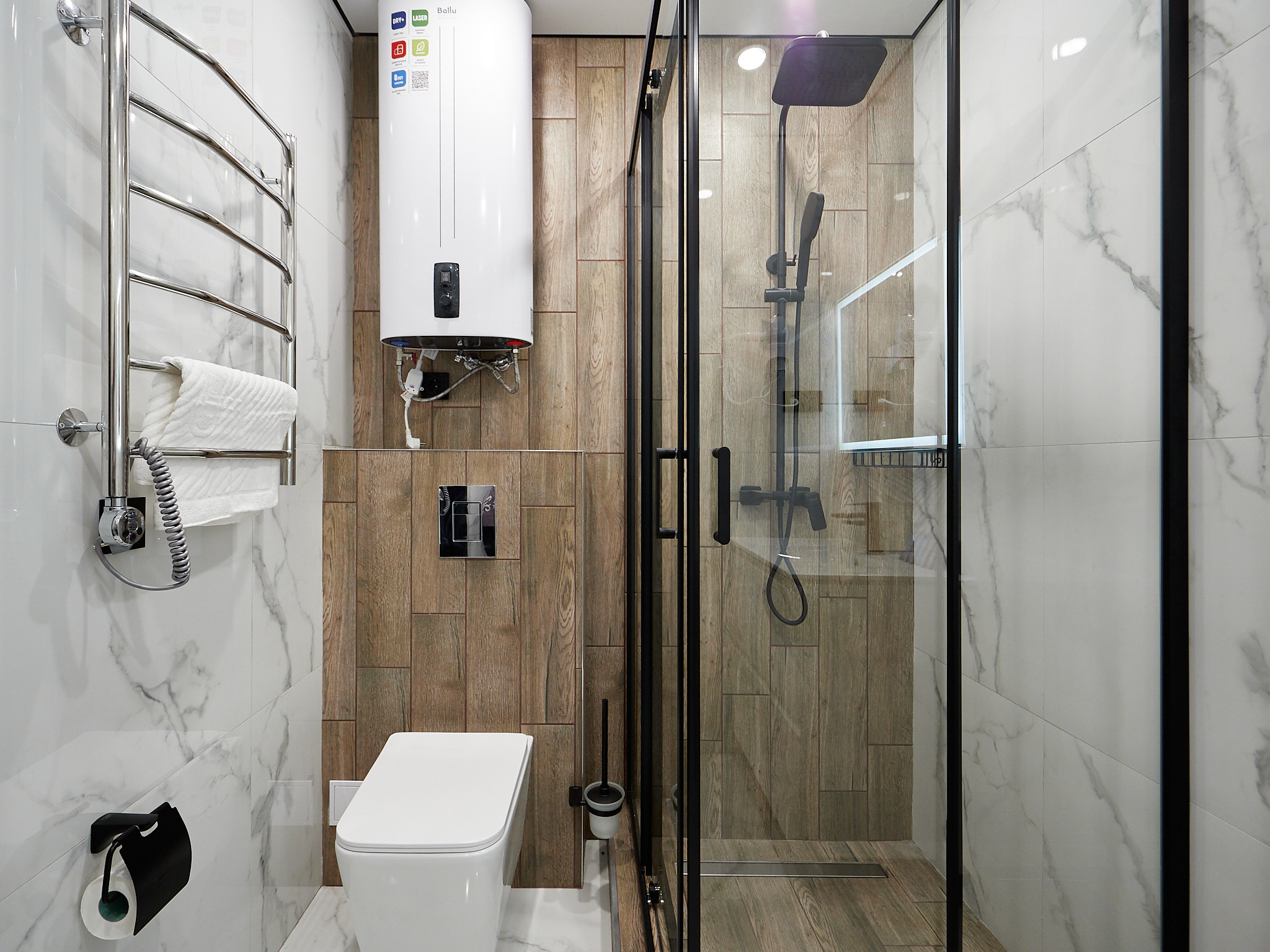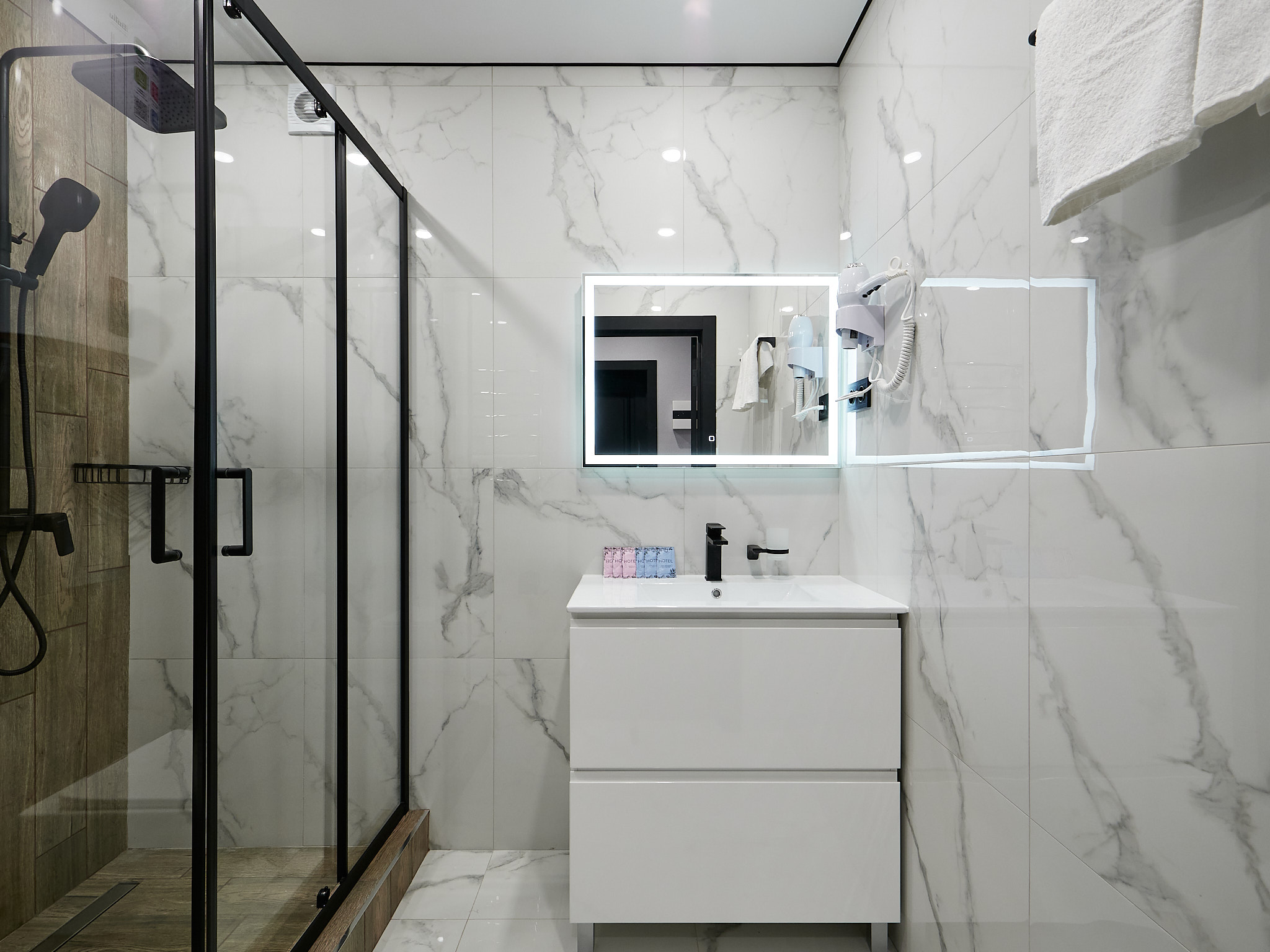 с душевой кабиной: ; туалетные принадлежности: ; фен: ;