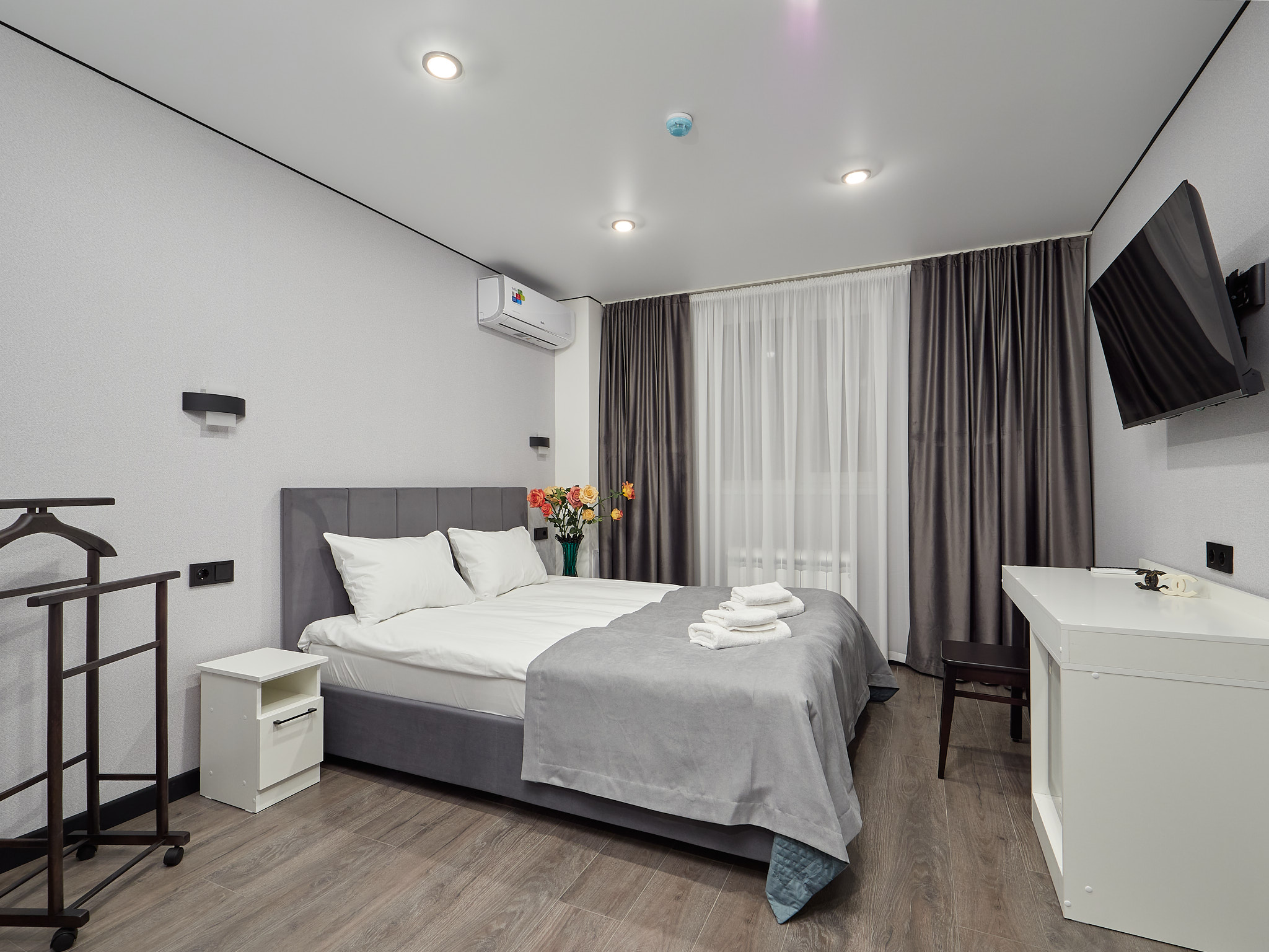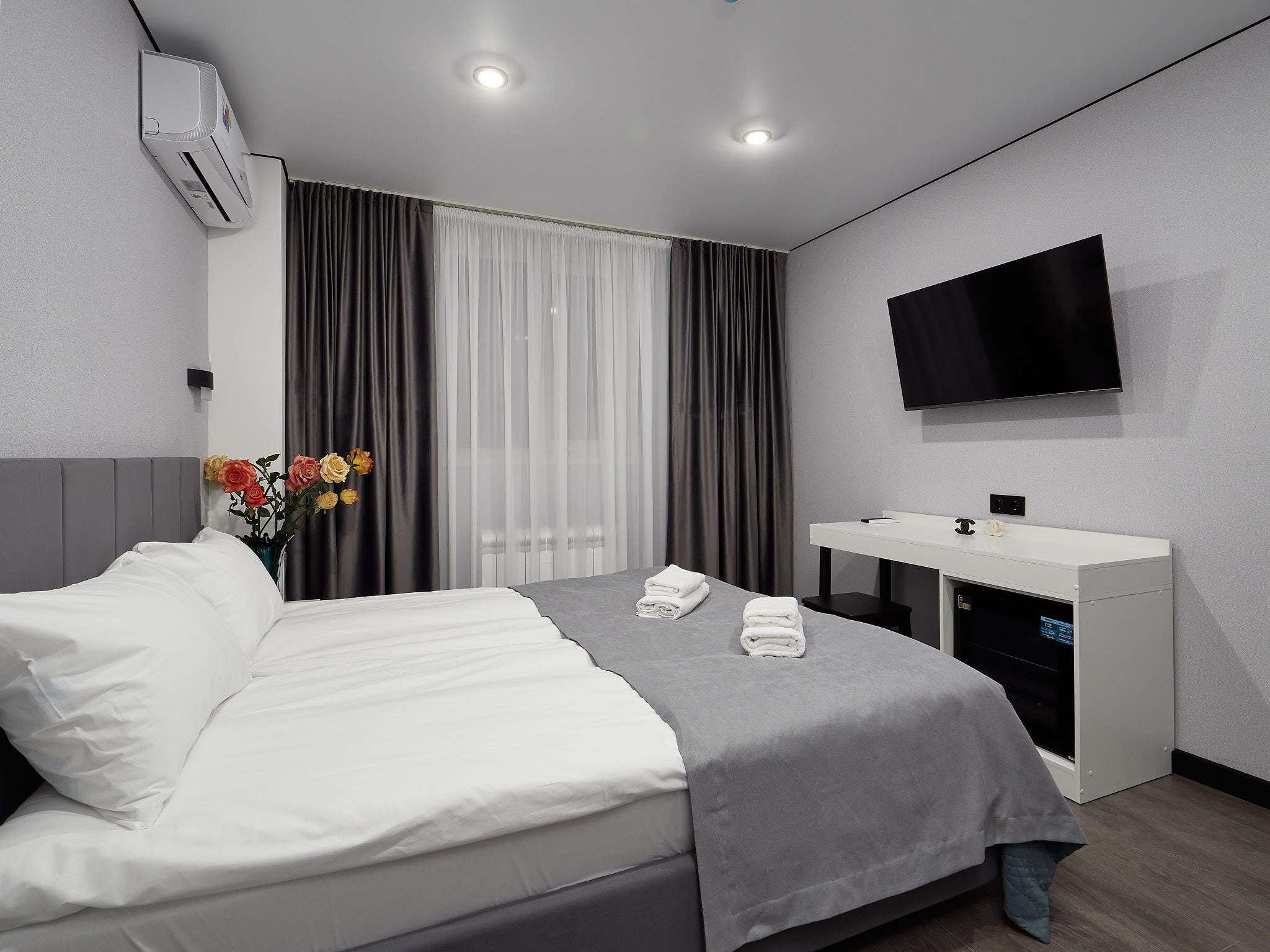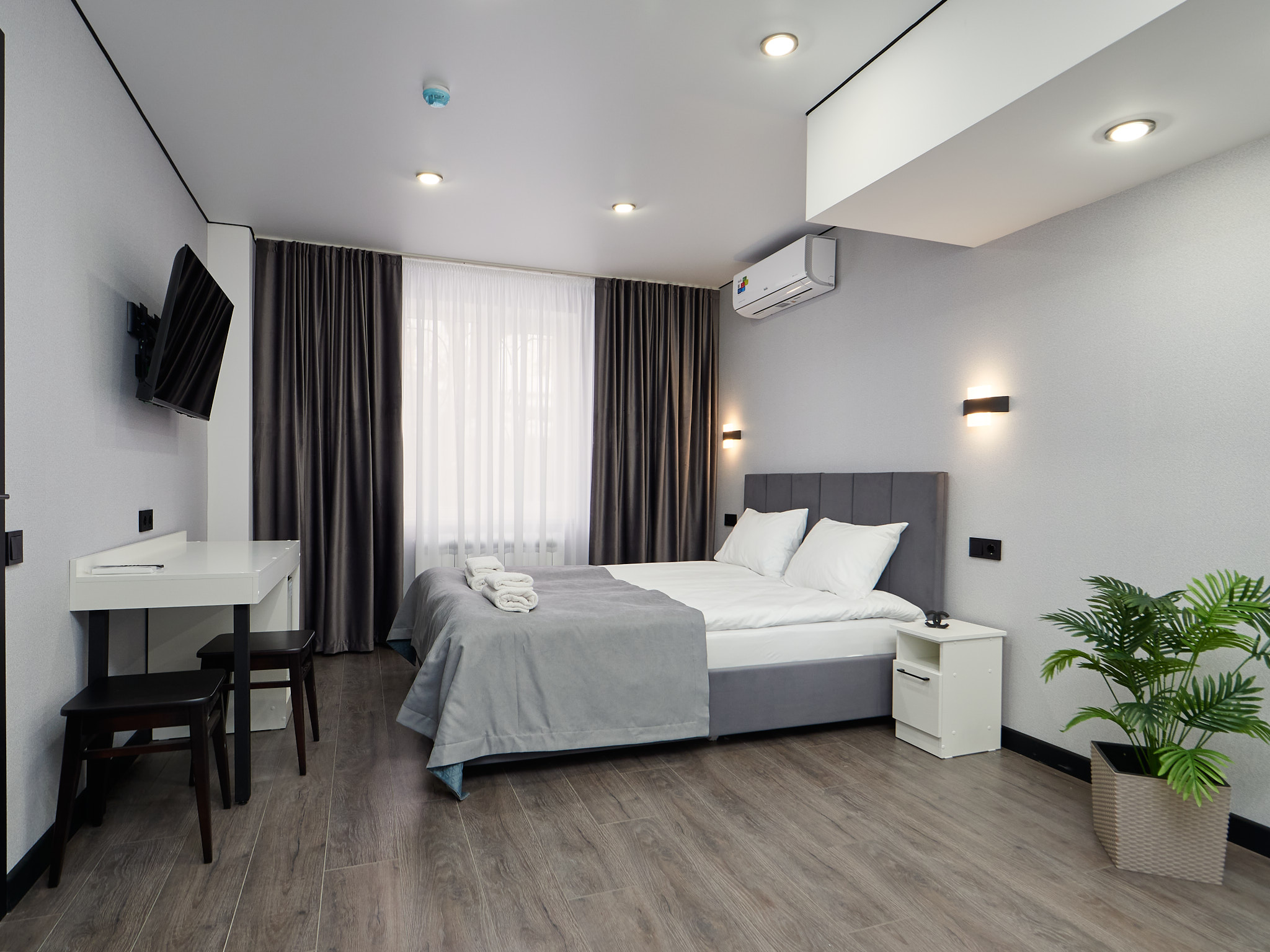 Отель расположился в шестиэтажном доме на улице Кирова. В распоряжении гостей 2- и 4-местные номера разной категории комфорта. Среди удобств – мини-холодильник, электрочайник, кондиционер, телевизор, Wi-fi-интернет и санузел с душевой кабиной или с джакузи.