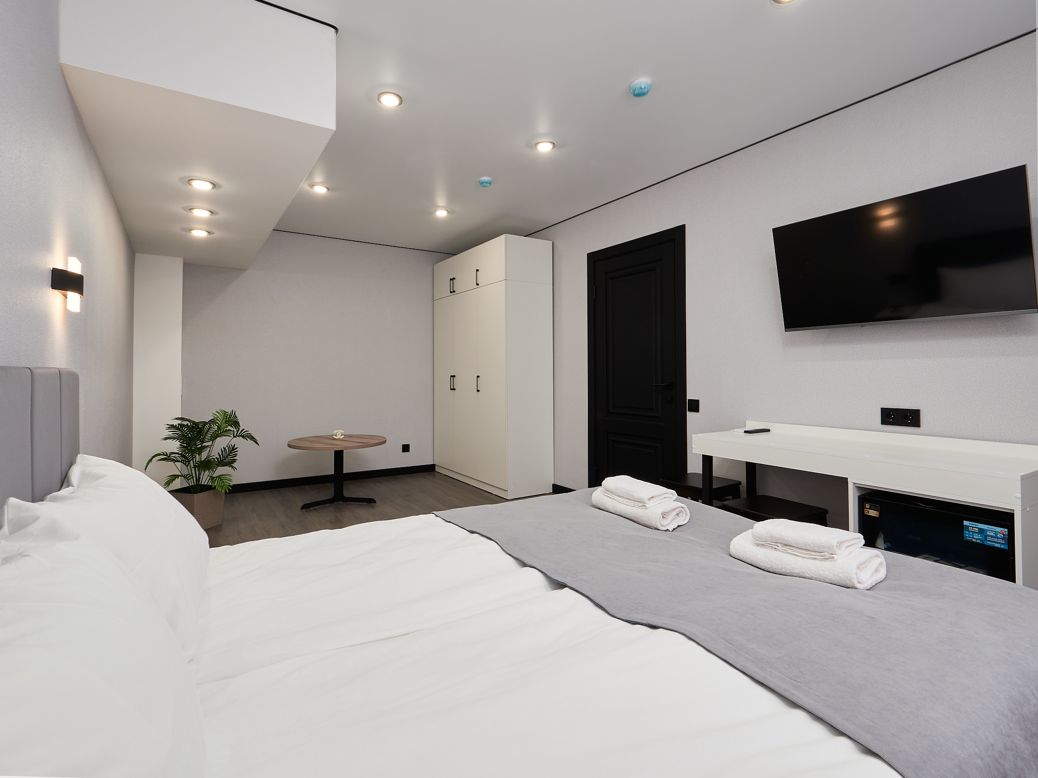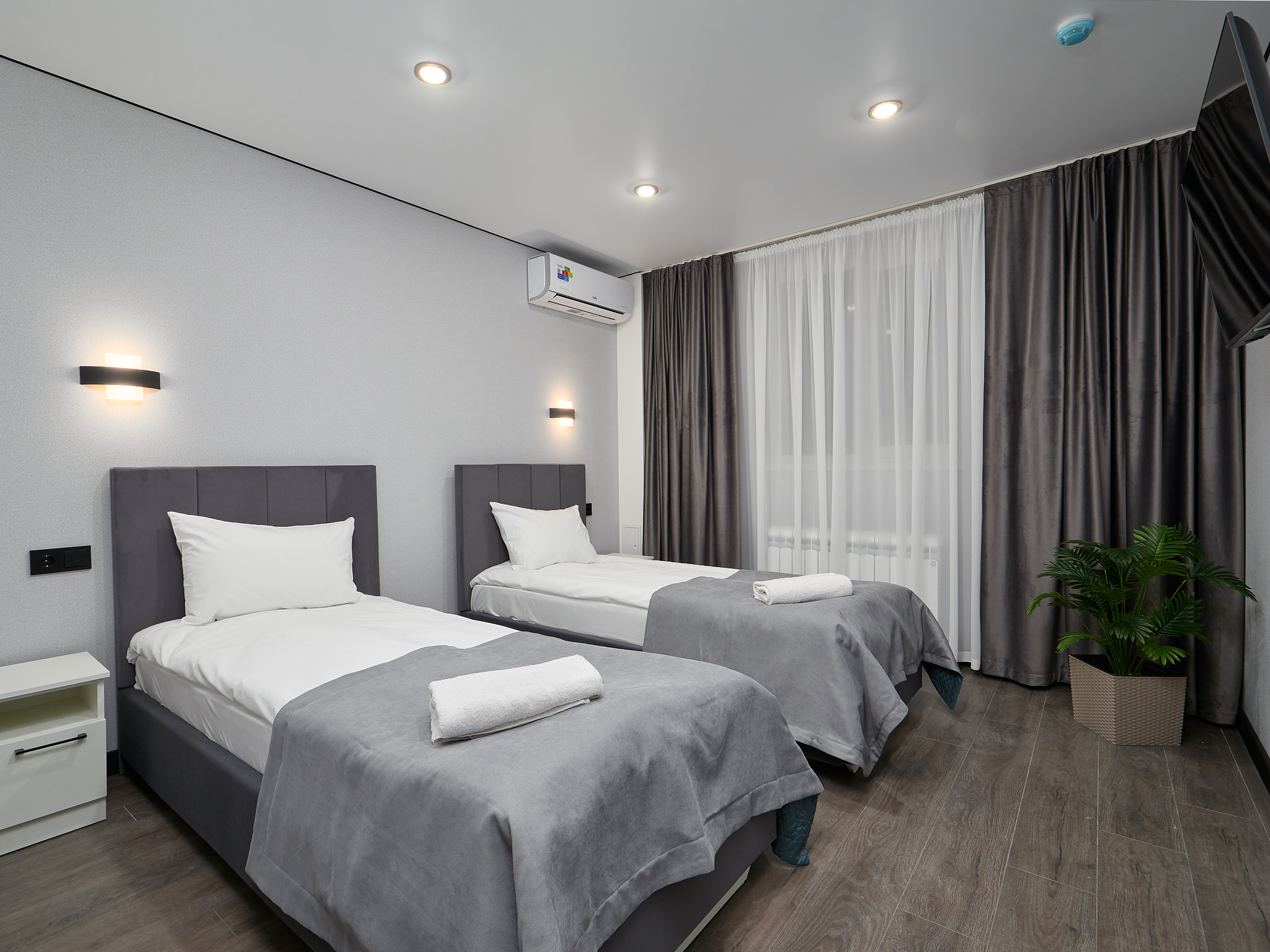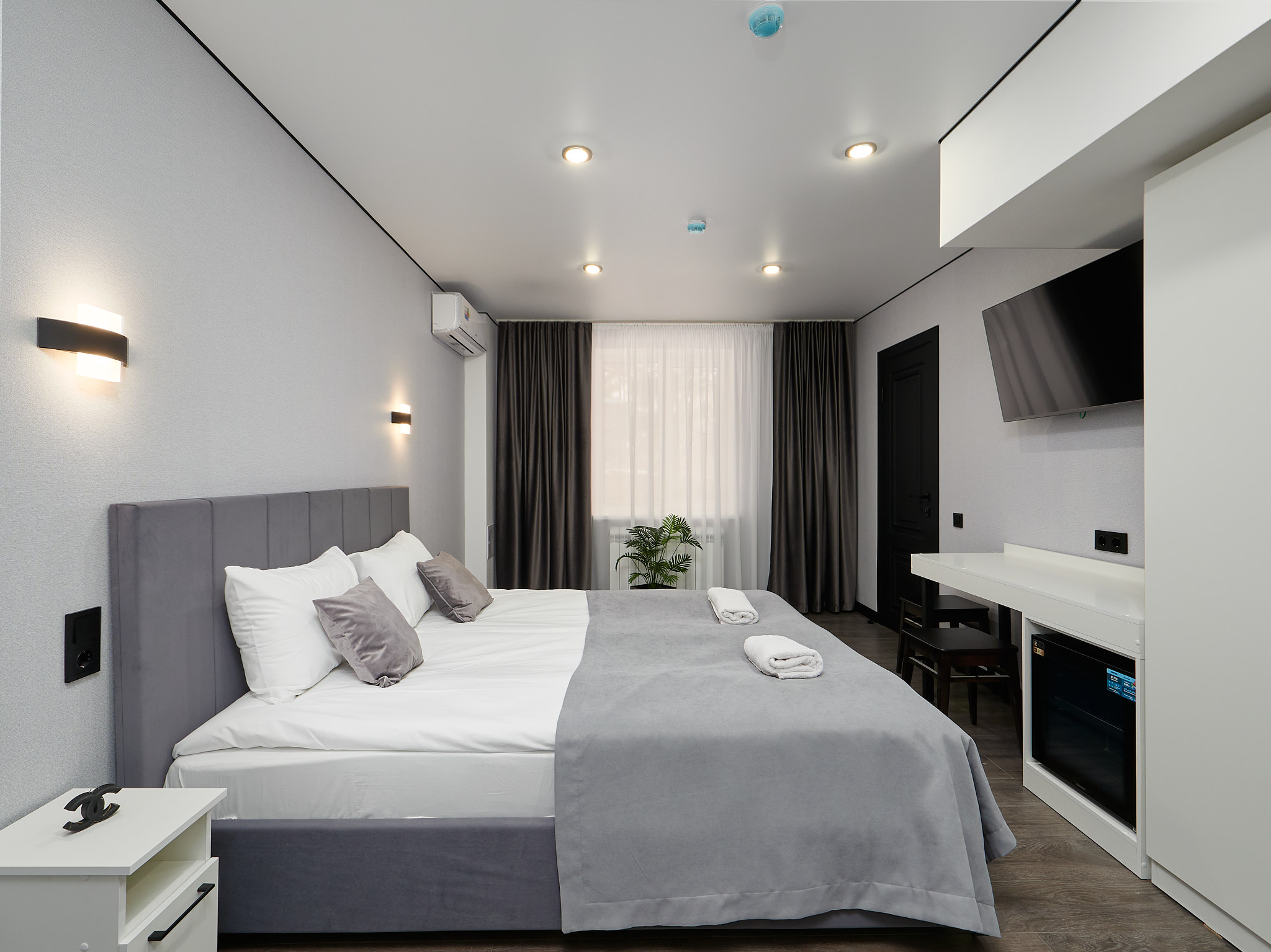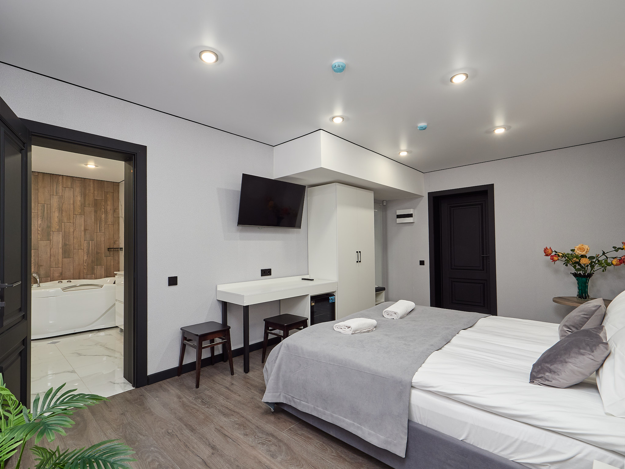 Отель расположился в шестиэтажном доме на улице Кирова. В распоряжении гостей 2- и 4-местные номера разной категории комфорта. Среди удобств – мини-холодильник, электрочайник, кондиционер, телевизор, Wi-fi-интернет и санузел с душевой кабиной или с джакузи.