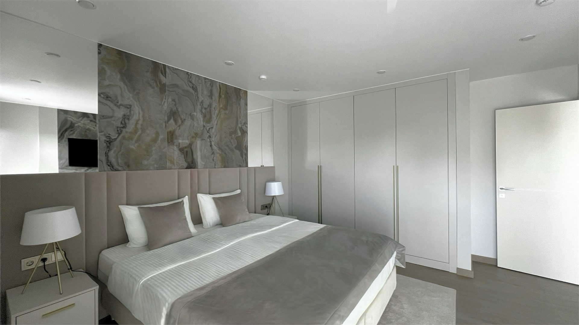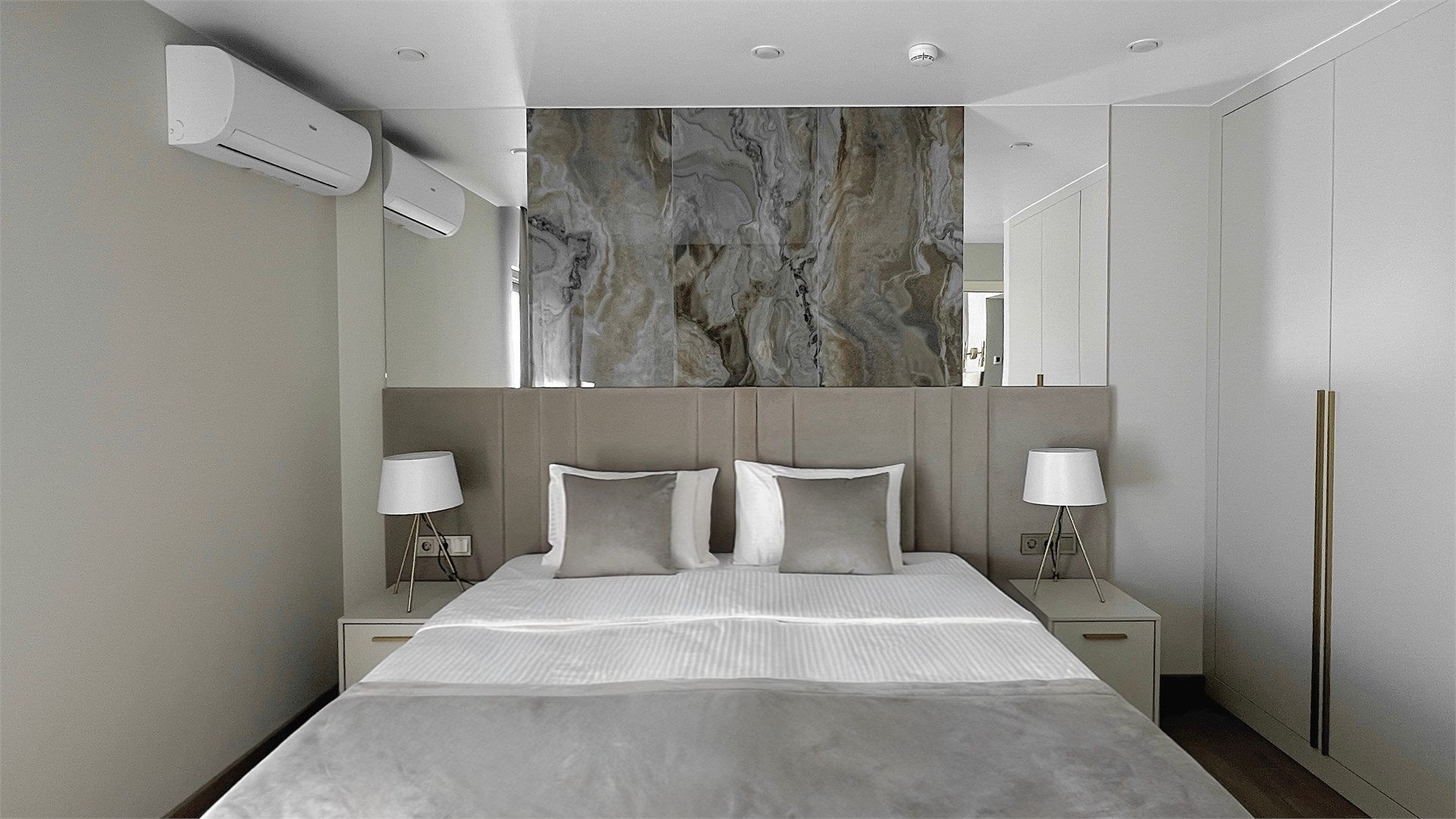 зеркало: ; кресло-кровать: ; кровать двуспальная: ; прикроватные тумбочки: ; столик туалетный: ; стул: ; шкаф: ;