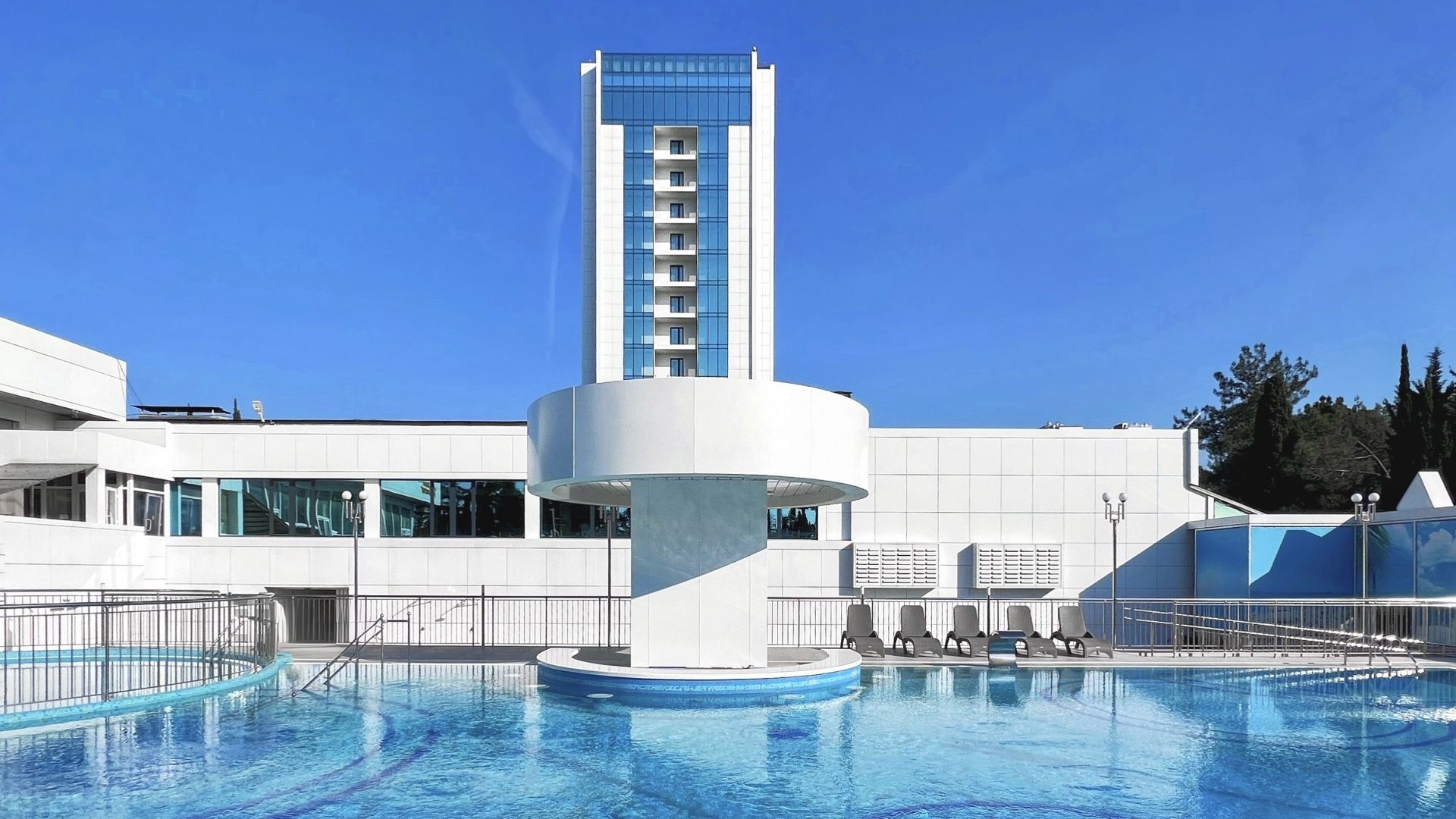 Отдельного внимания заслуживает собственный хвойный парк отеля — живописный зеленый оазис в нескольких шагах от оживленной набережной. Здесь можно насладиться умиротворяющей тишиной, подышать целебным воздухом вечнозеленых деревьев и отдохнуть от городской суеты.
