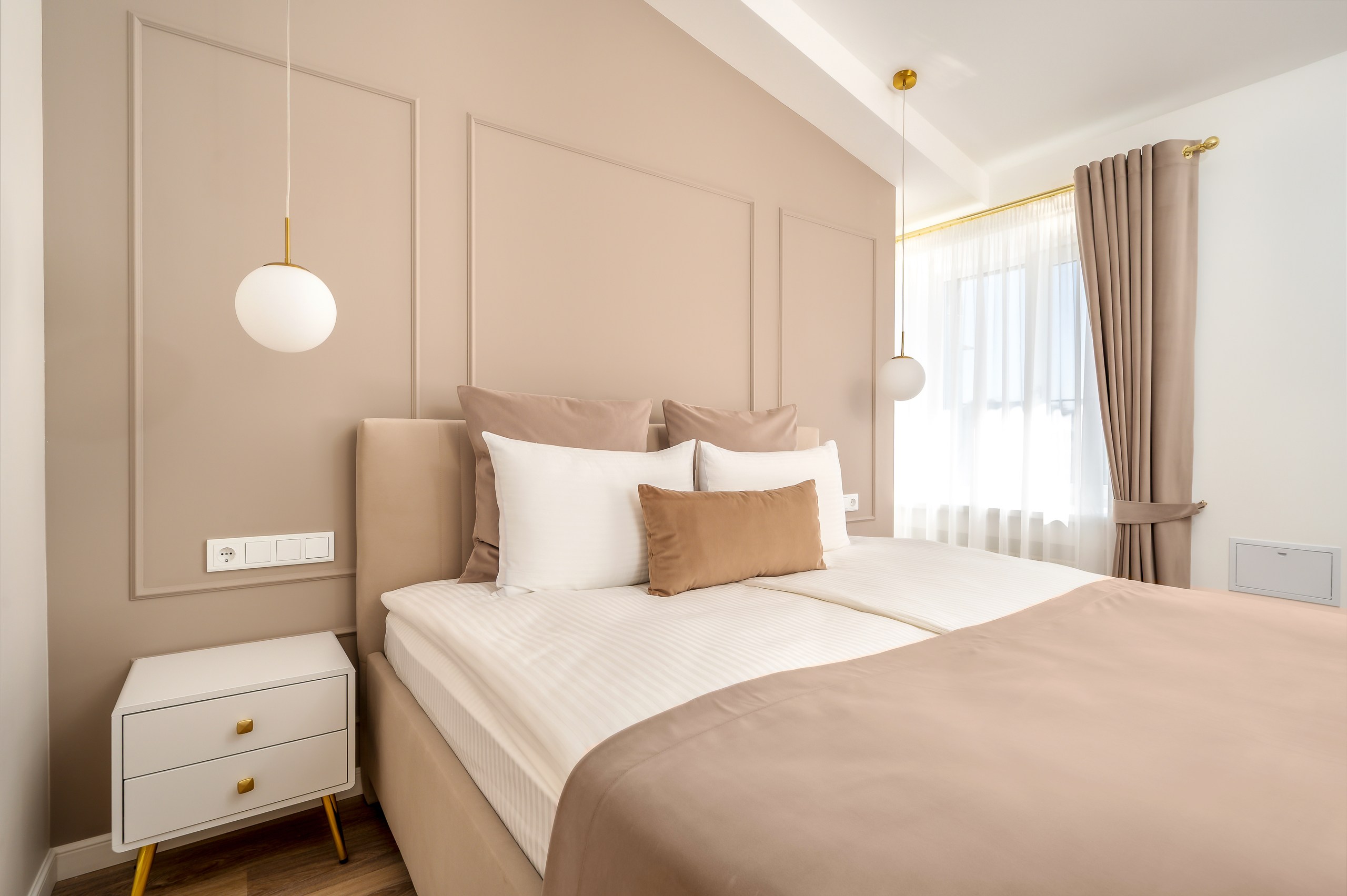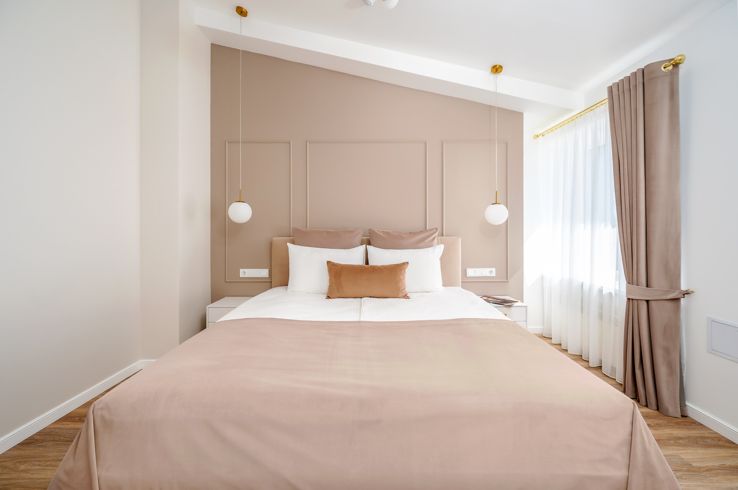 кровать двуспальная: ; прикроватные тумбочки: ; шкаф: ;