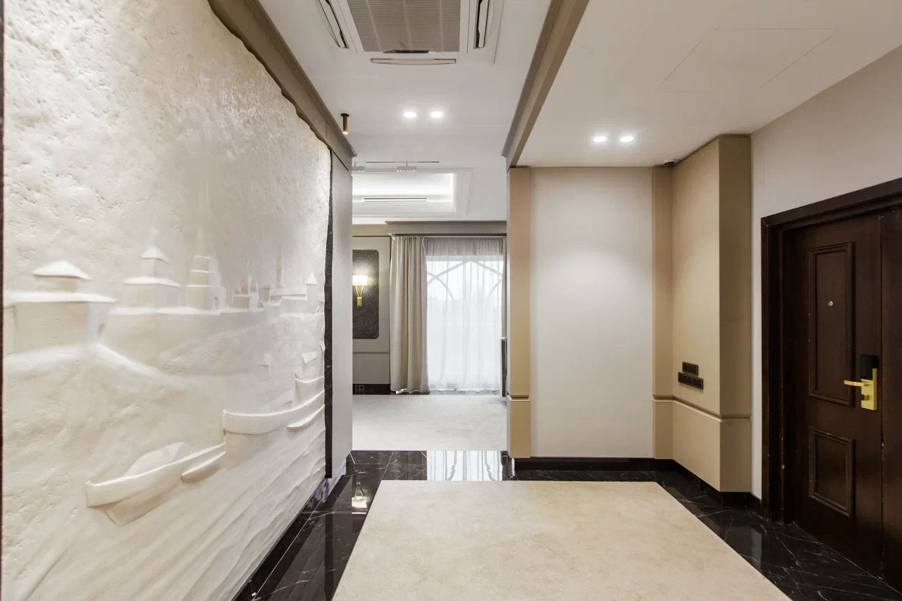 вешалка: ; зеркало: ; ковровое покрытие: ; кровать двуспальная: ; прикроватные тумбочки: ; стол: ; стулья: ; шкаф: ;