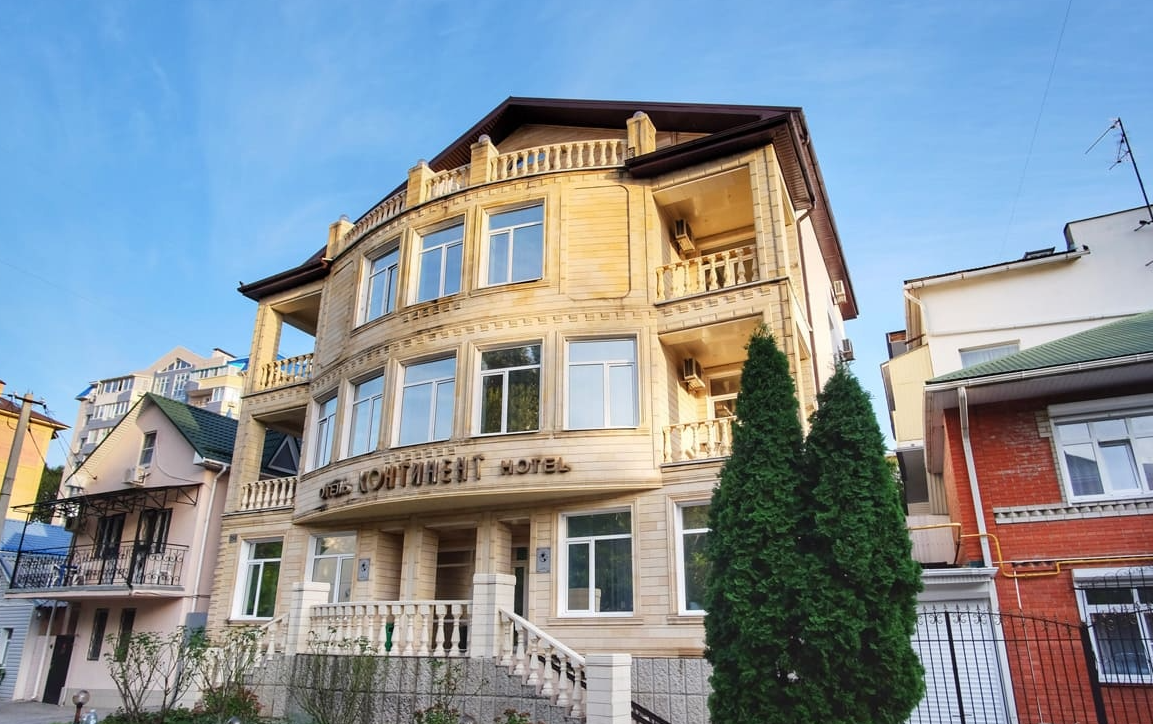 Небольшая территория отеля «Континент» представляет собой внутренний дворик с зеленью и цветами, закрытый от посторонних. Четырехэтажный корпус отеля насчитывает около 15 номеров различной категории от «люкса» до «стандарта» с разным количеством комнат и мест, рассчитанных на одновременное проживание более 40 человек. Все гостиничные номера хорошо меблированы и обеспечены необходимой бытовой техникой: кондиционером, холодильником, телевизором и Wi-Fi. Каждый номер отеля имеет отдельный санузел с душем, все, без исключения, выходят на балкон или террасу, автономную или общую, часто – с садовой мебелью.