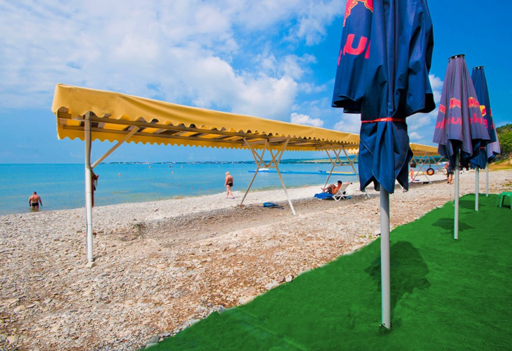 Городской пляж разместился всего в 200 метрах от комплекса. На галечном побережье установлены раздевалки, лежаки и навесы от солнца.