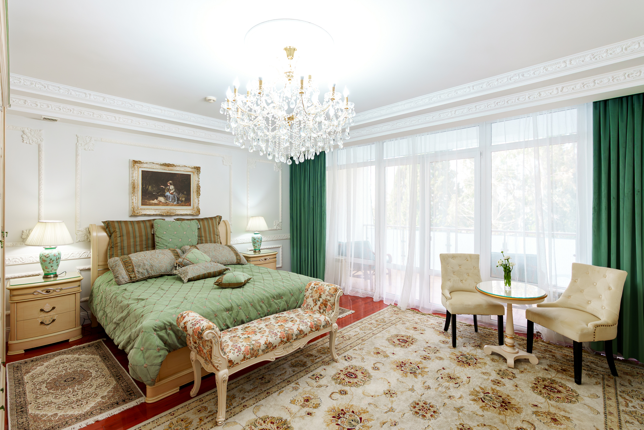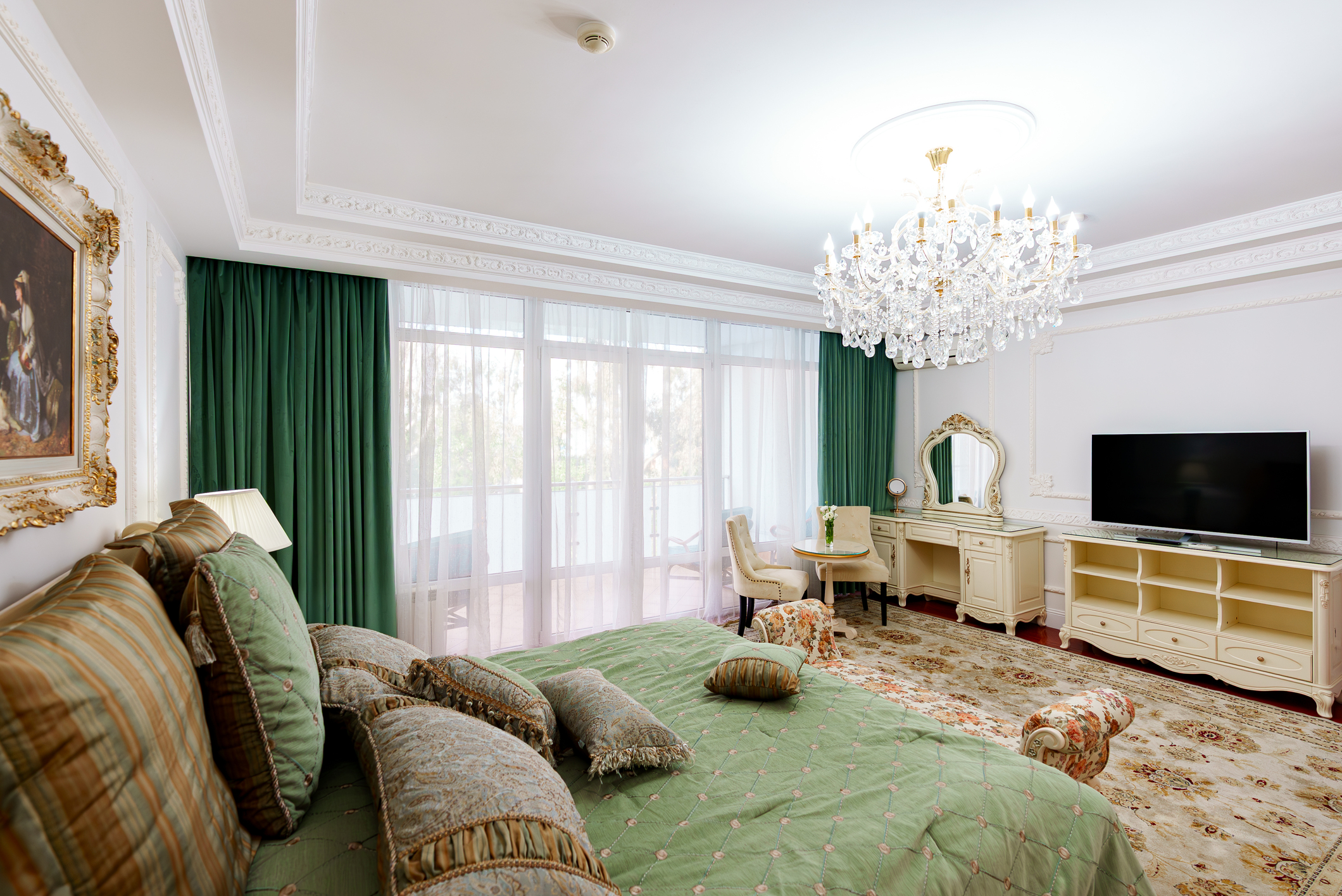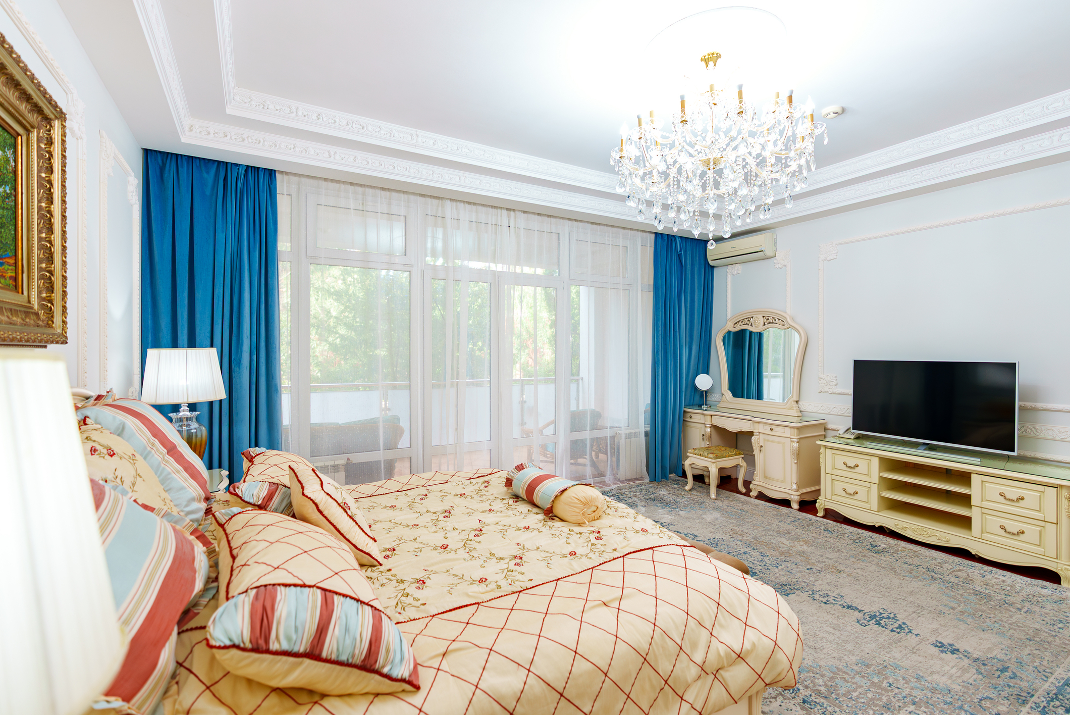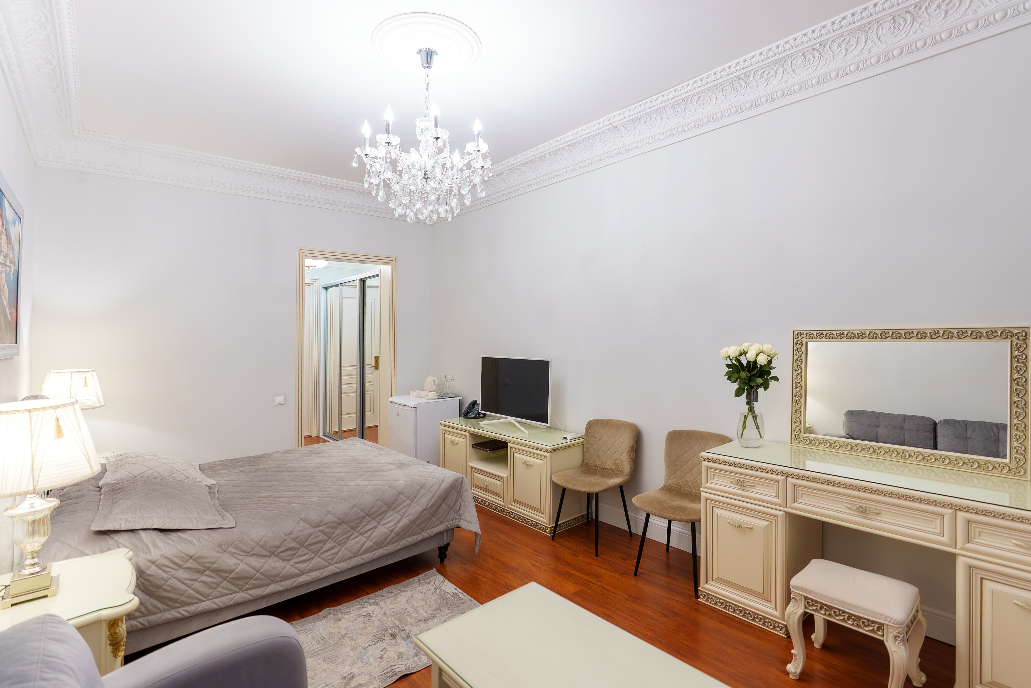 кровать двуспальная; прикроватные тумбочки; стол; стулья; тумба под телевизор; шкаф;