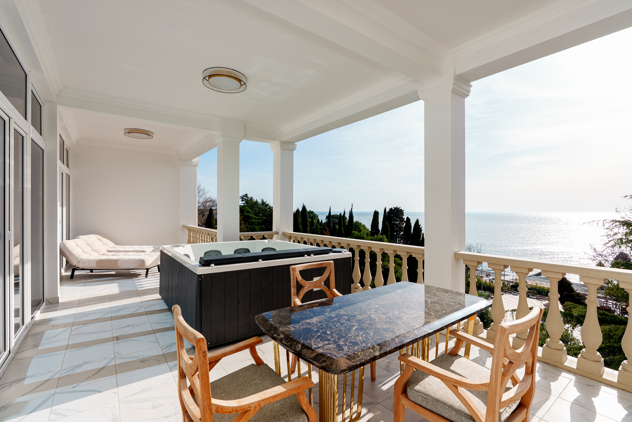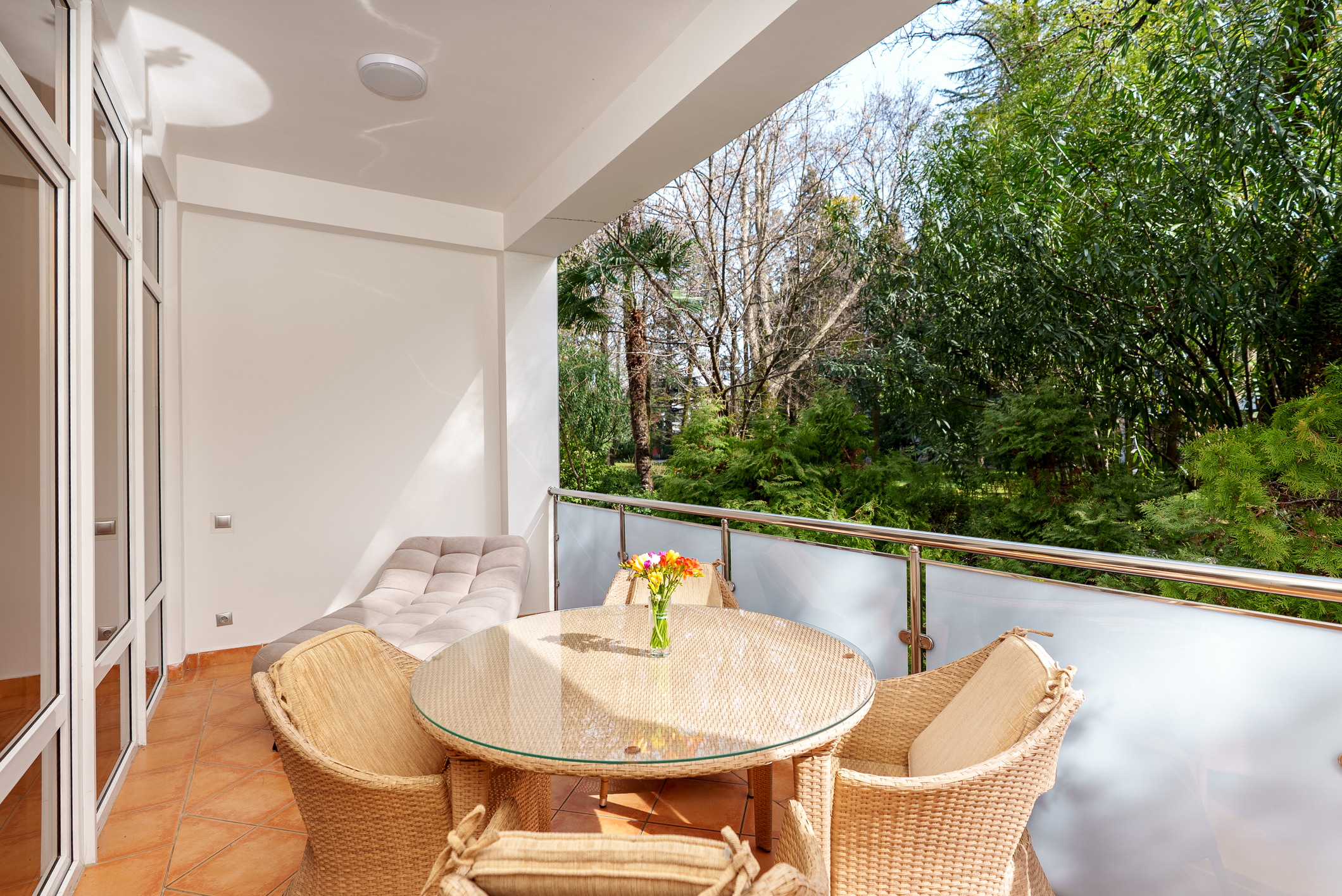 с мебелью: (ротанговая) и шезлонги;