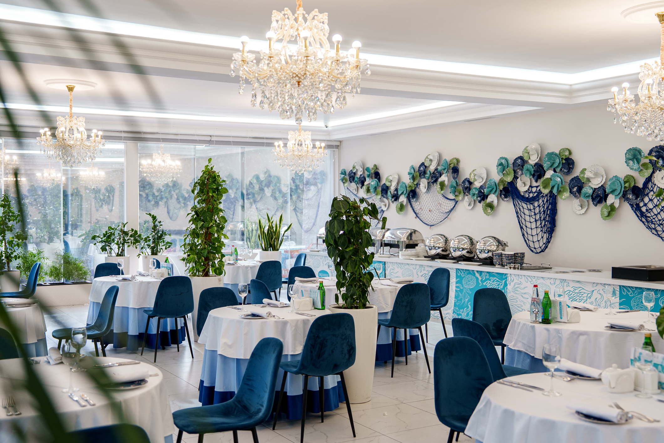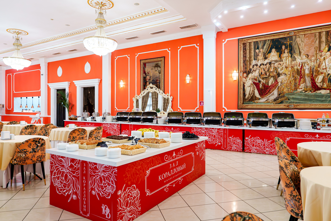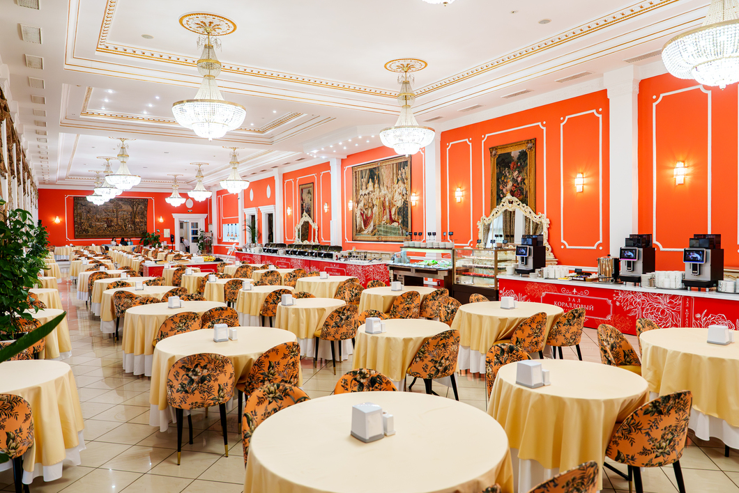 - обеденный зал: Залы питания Коралловый, Серебряный, Золотой, Зелёный - расположены в 3 корпусе, питание для гостей, проживающих в категориях Станартный, вид питания - шведский стол;