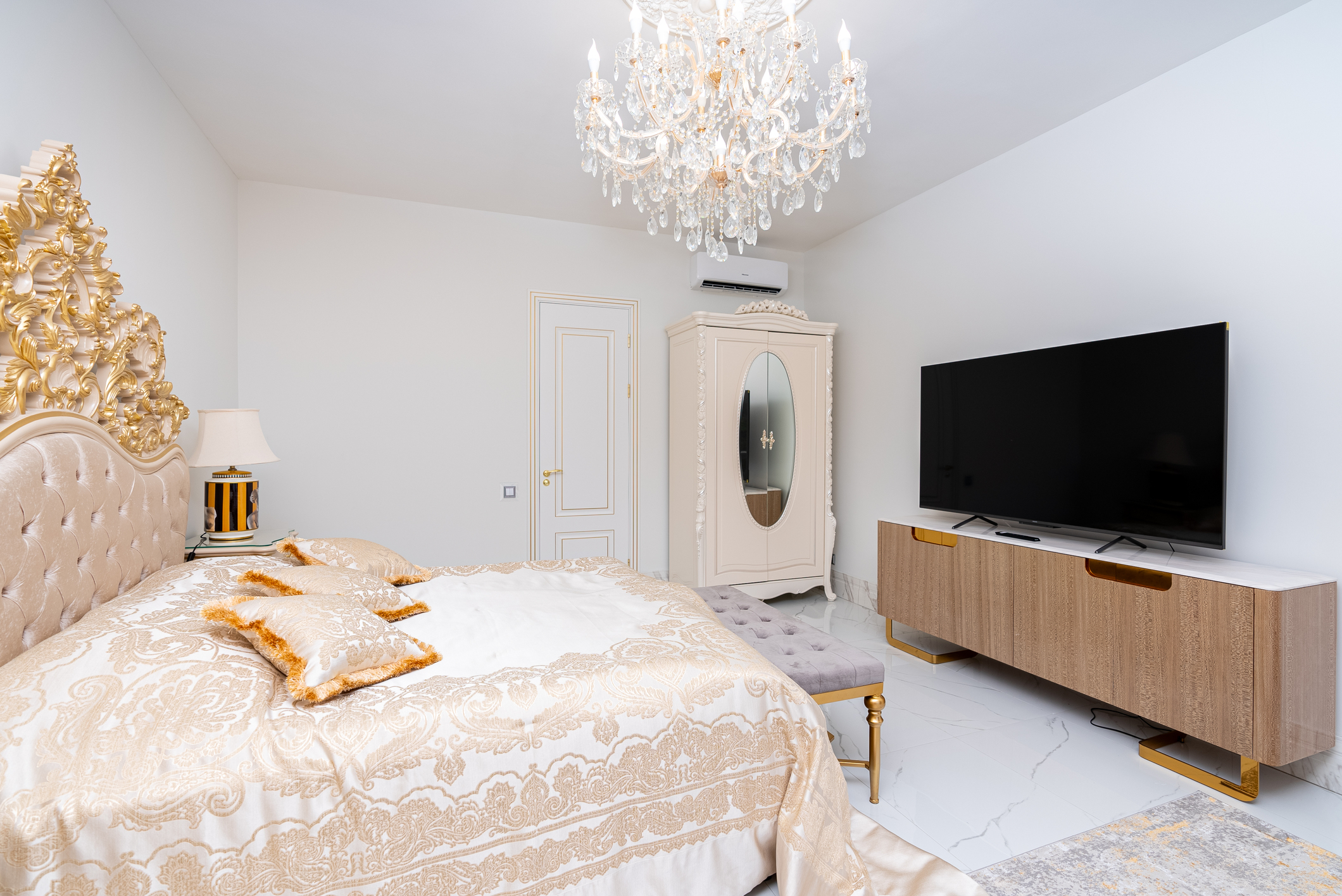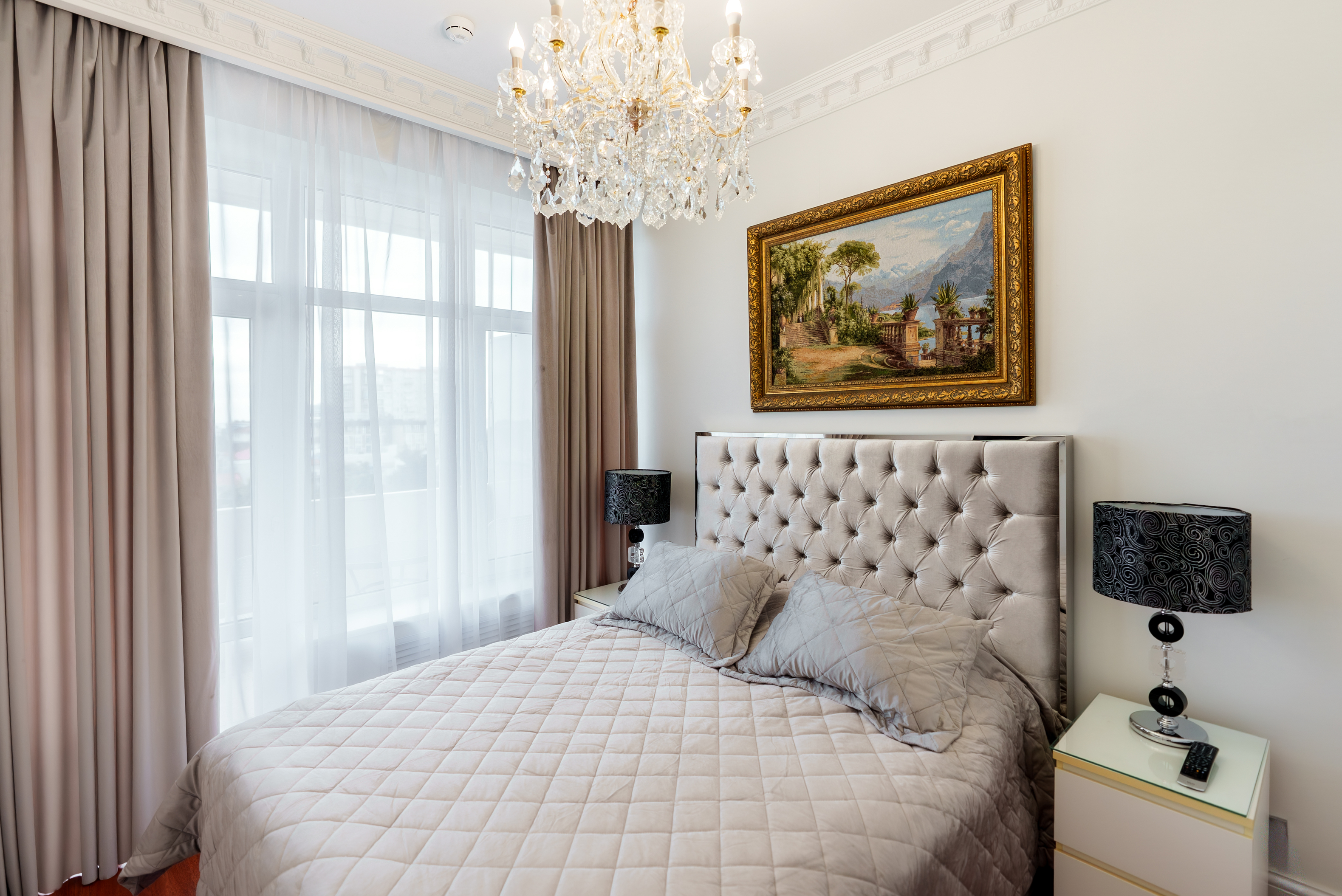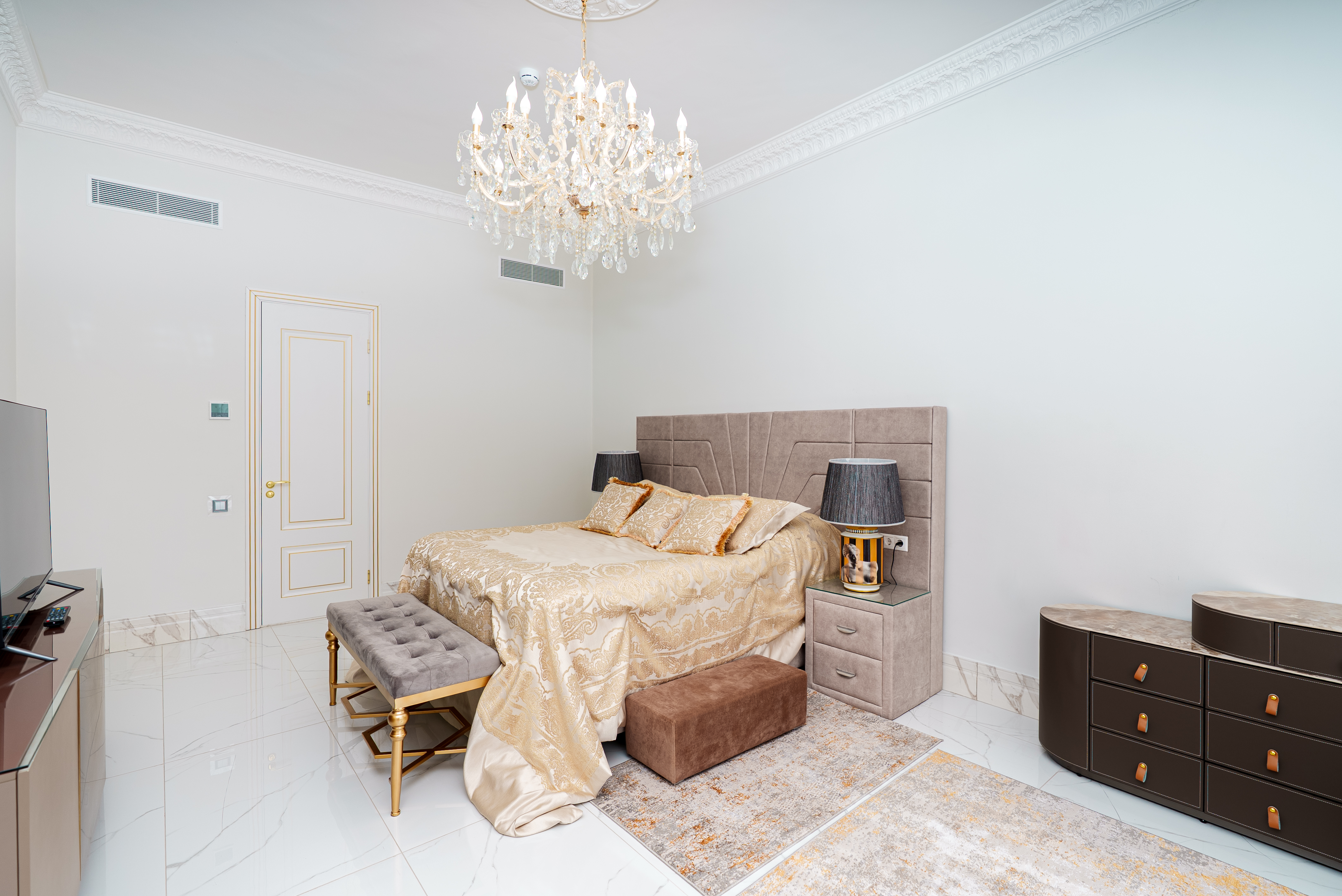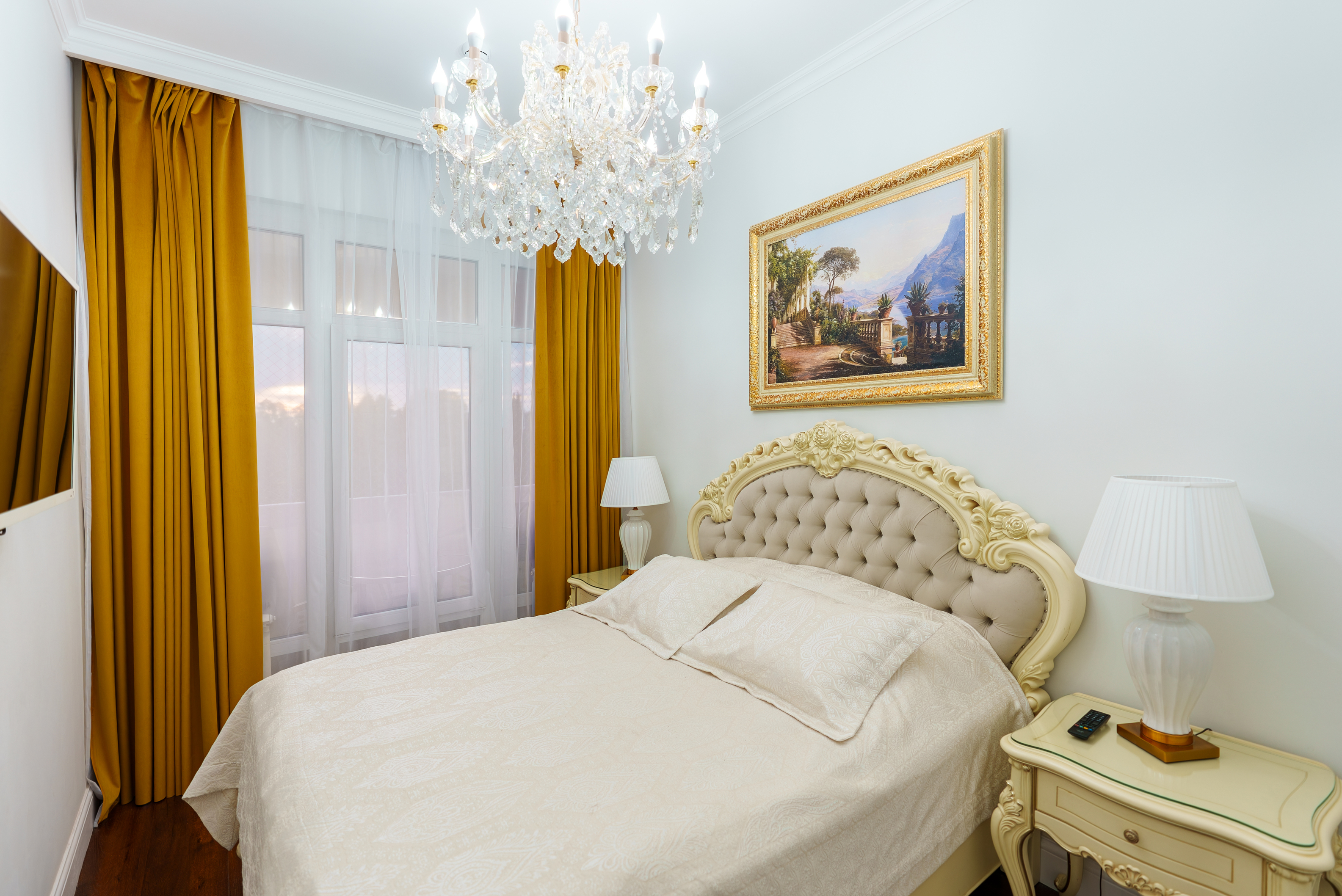 кровать двуспальная: ; прикроватные тумбочки: ; шкаф: ;