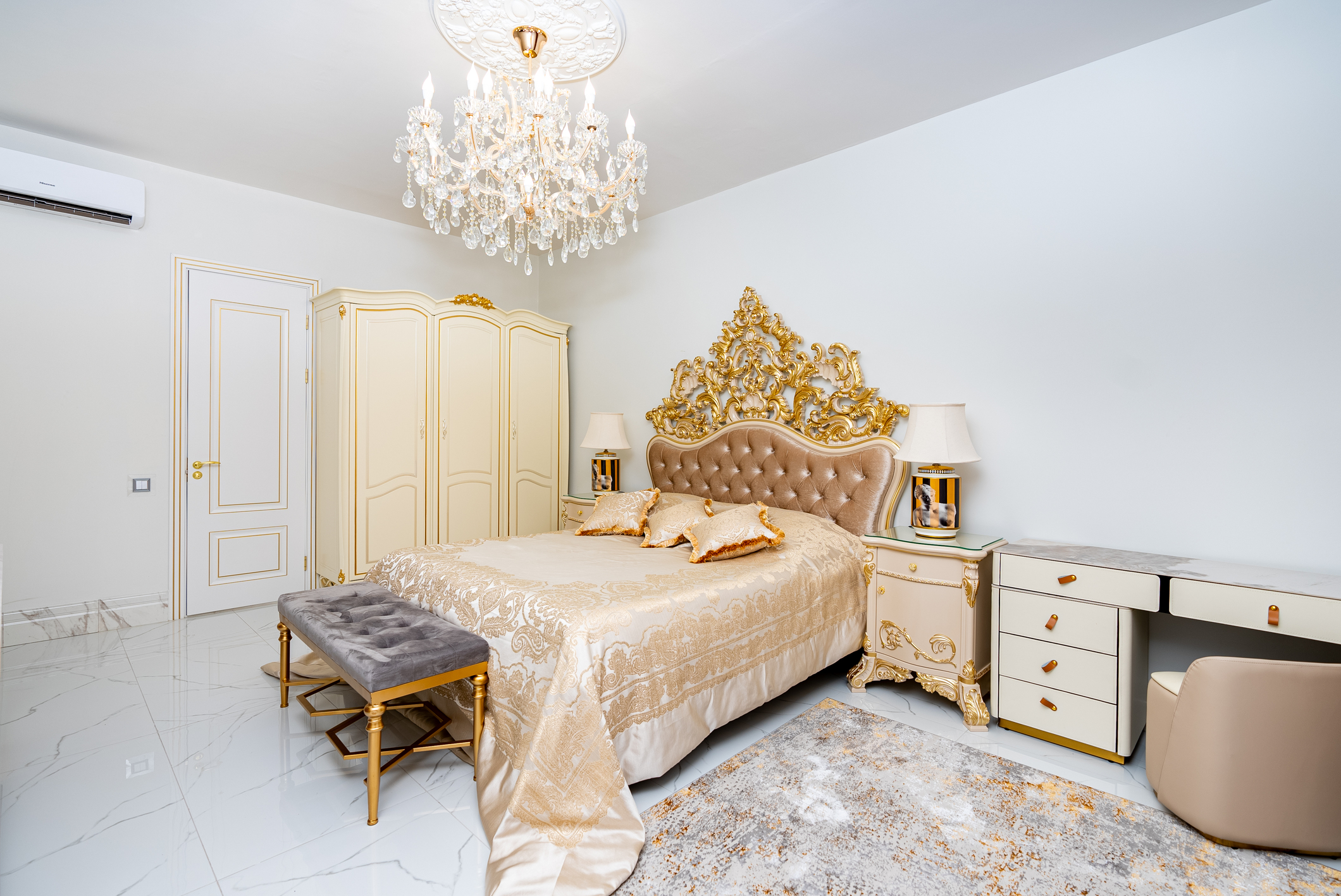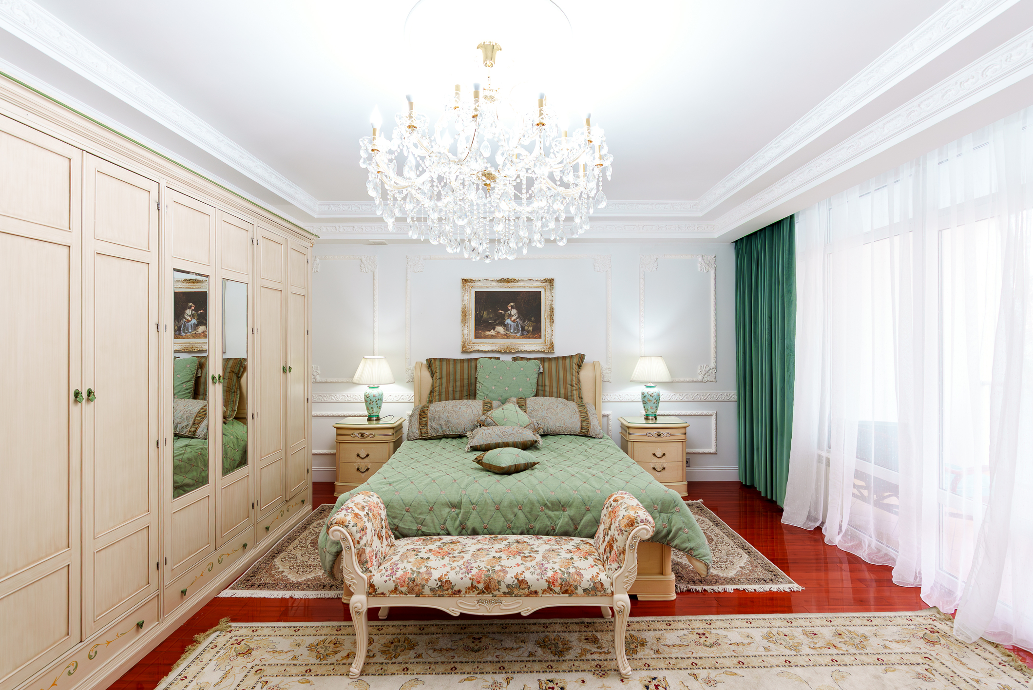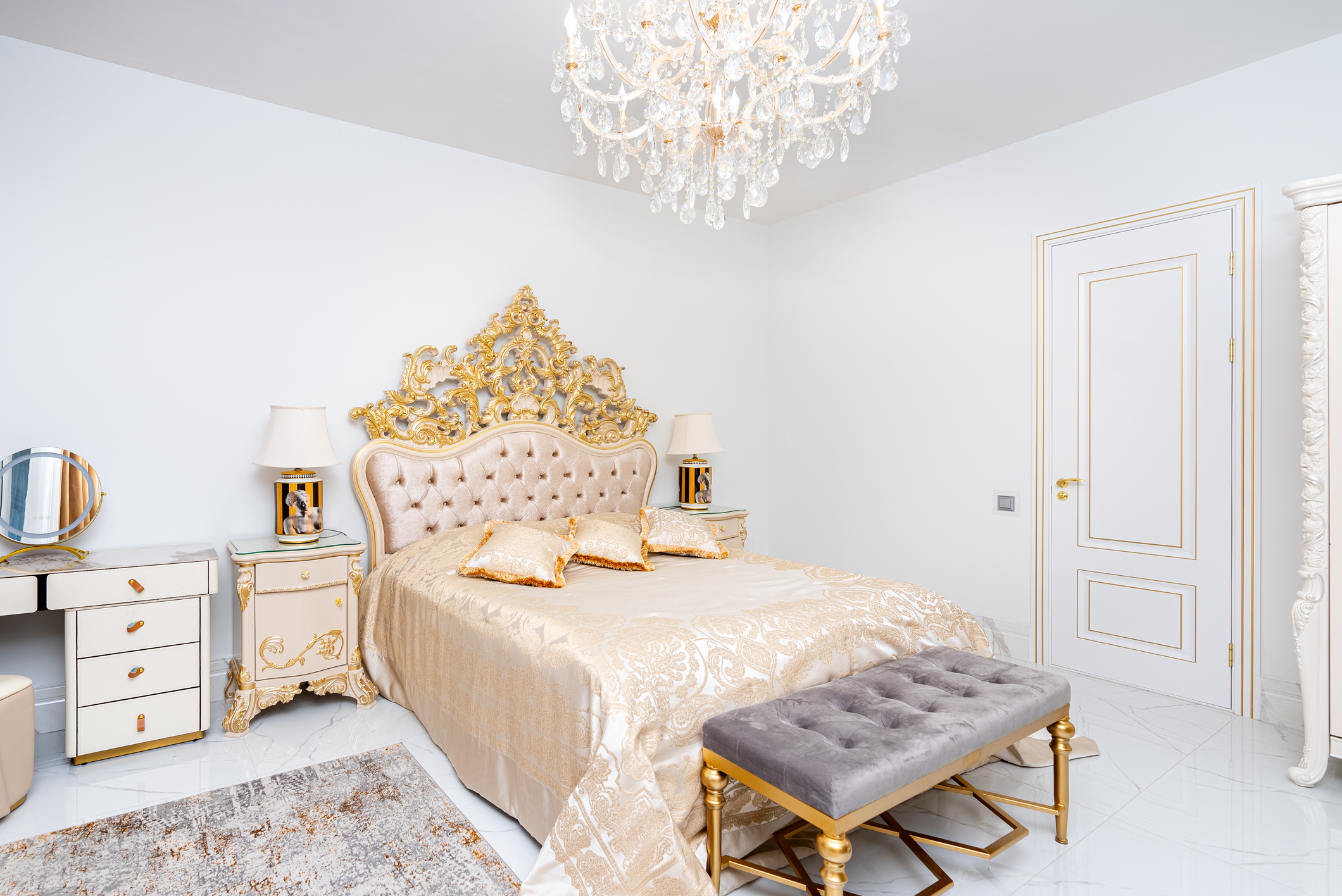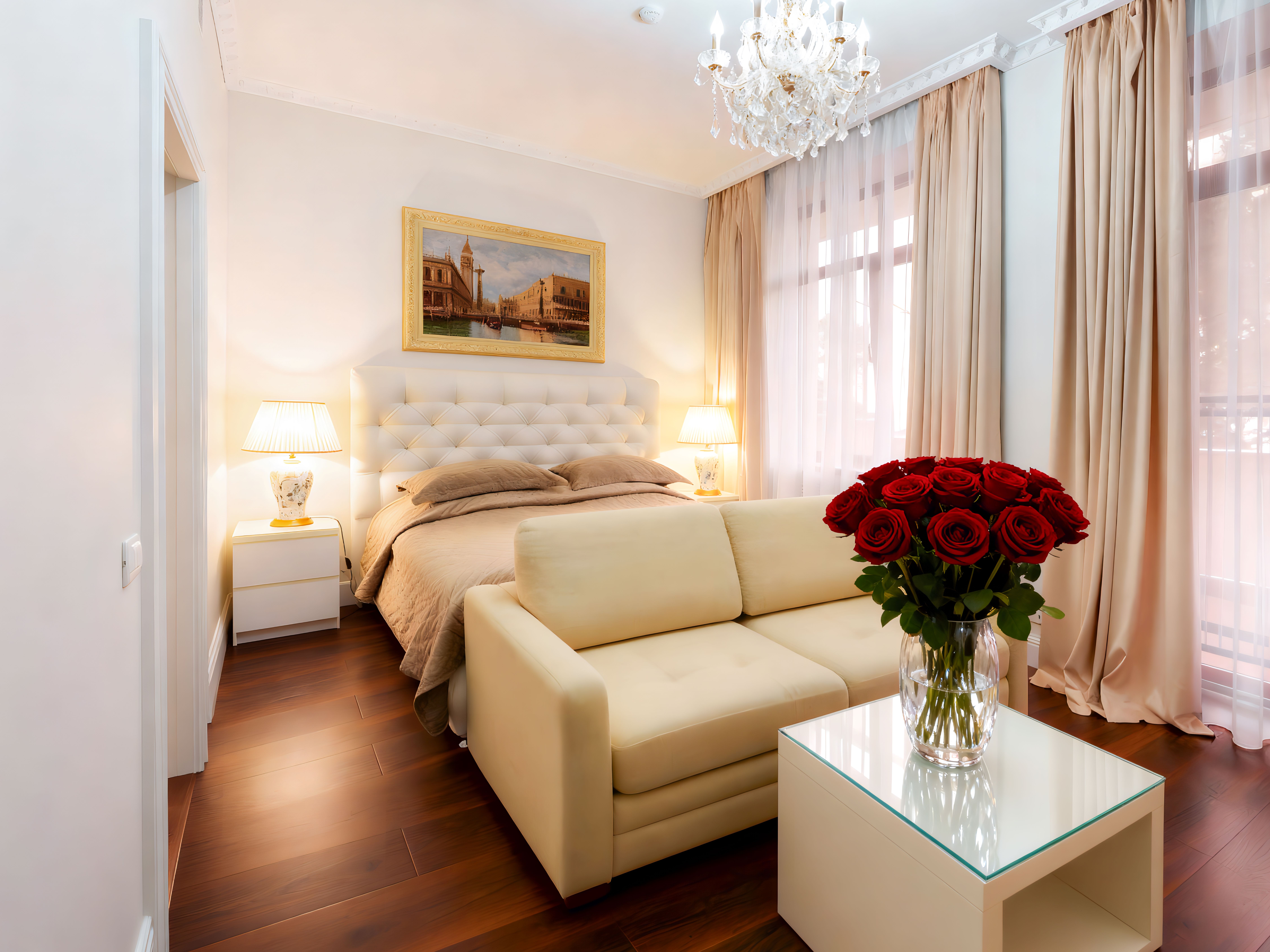 кровать двуспальная: ; прикроватные тумбочки: ; шкаф: ;