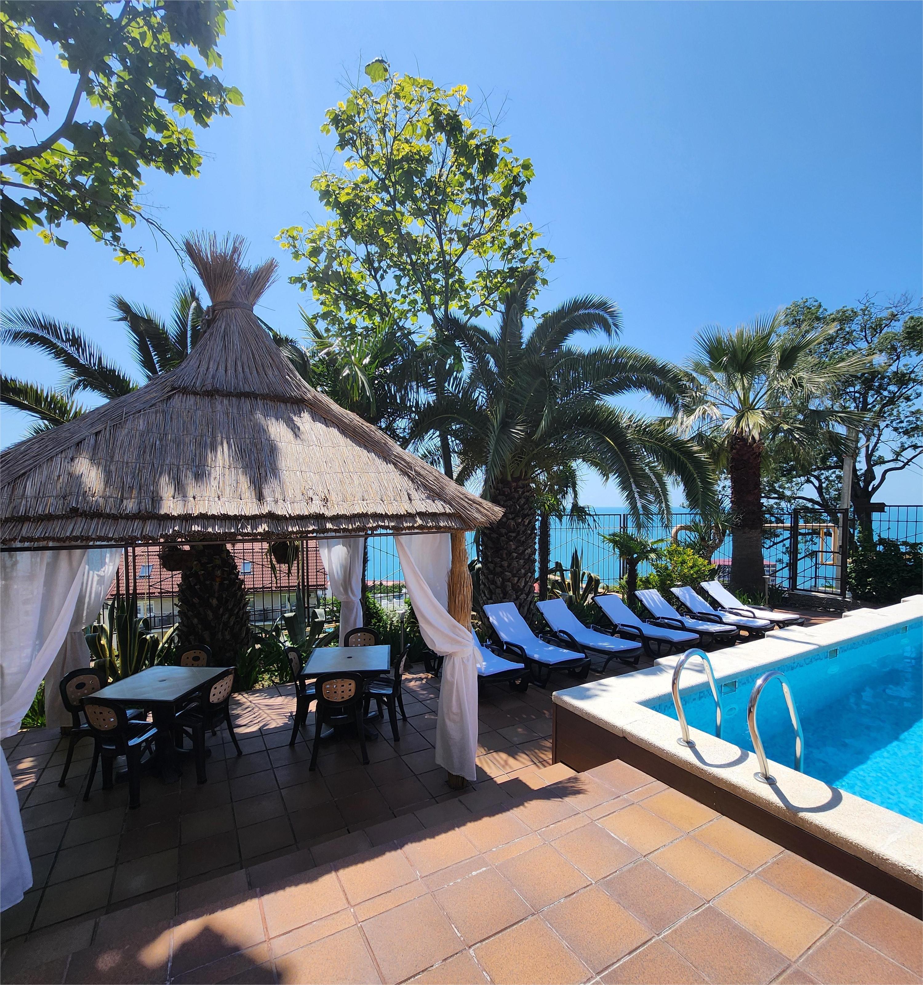 На ухоженной, закрытой территории отеля «Олеся Лоо» в 0,2 га хватает места для отдыха, игр и уединения. Открытый пресноводный бассейн, размерами 5Х10 м, имеет удобную релакс-зону с шезлонгами и открытой беседкой. Среди композиций пальм и других диковинок южной природы удобно разместились кафе-терраса, площадки: для мангала и игровая.