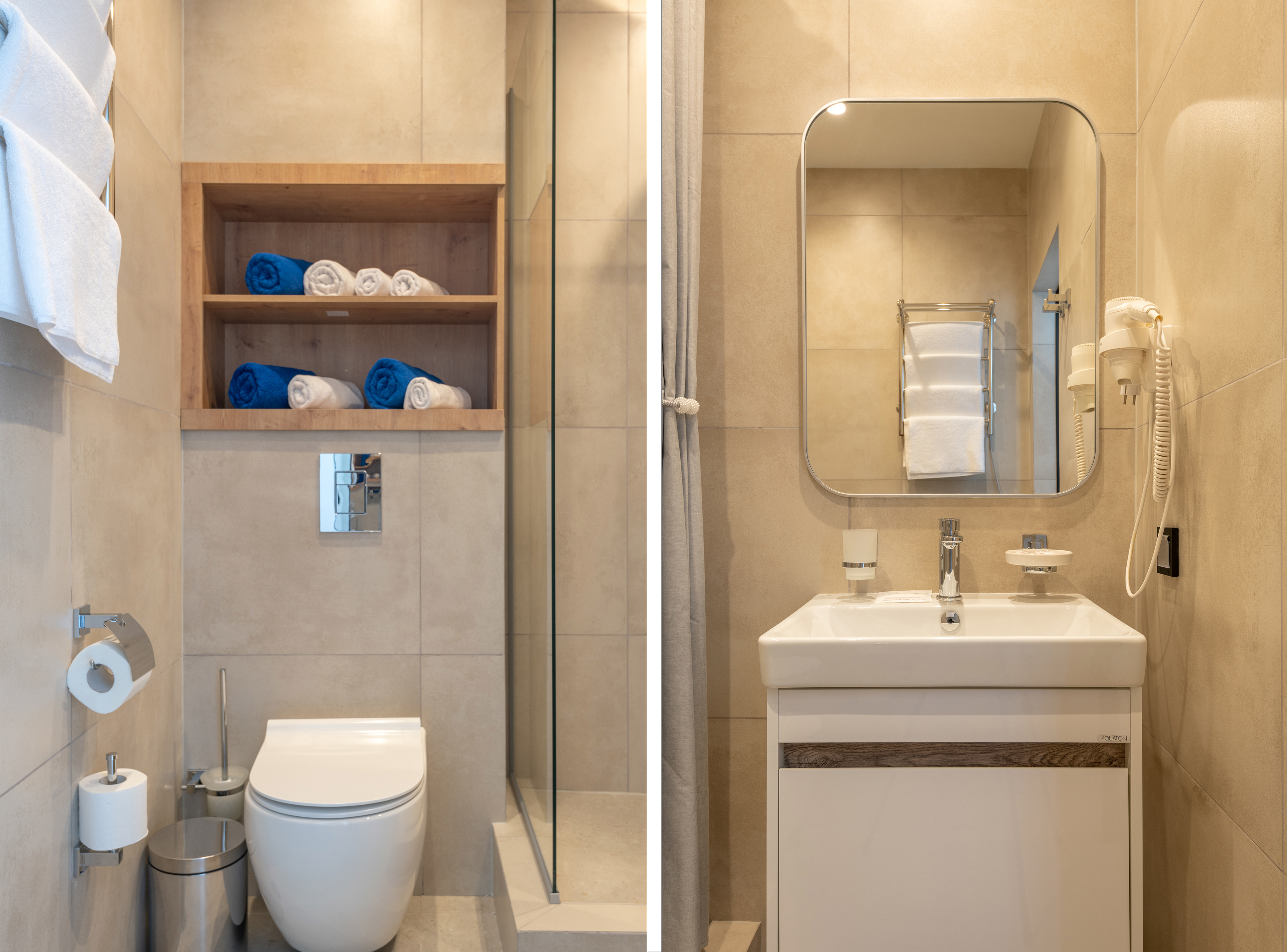 с душем: ; тапочки: ; туалетные принадлежности: ; фен: ;