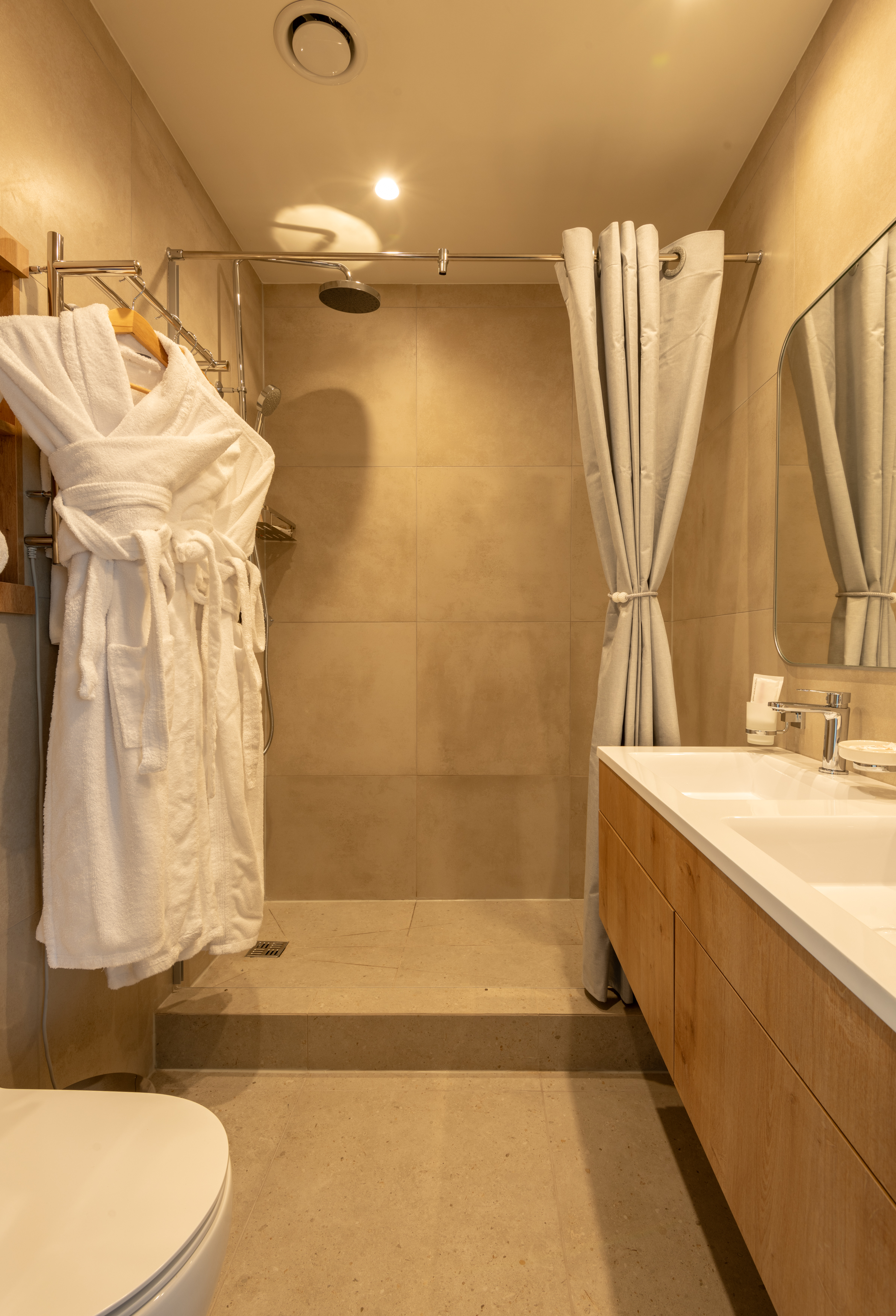 с душем: ; тапочки: ; туалетные принадлежности: ; фен: ; халат: ;