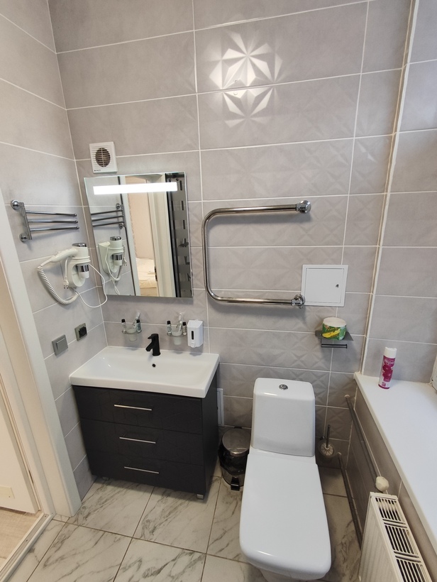 с ванной: ; туалетные принадлежности: ; фен: ;