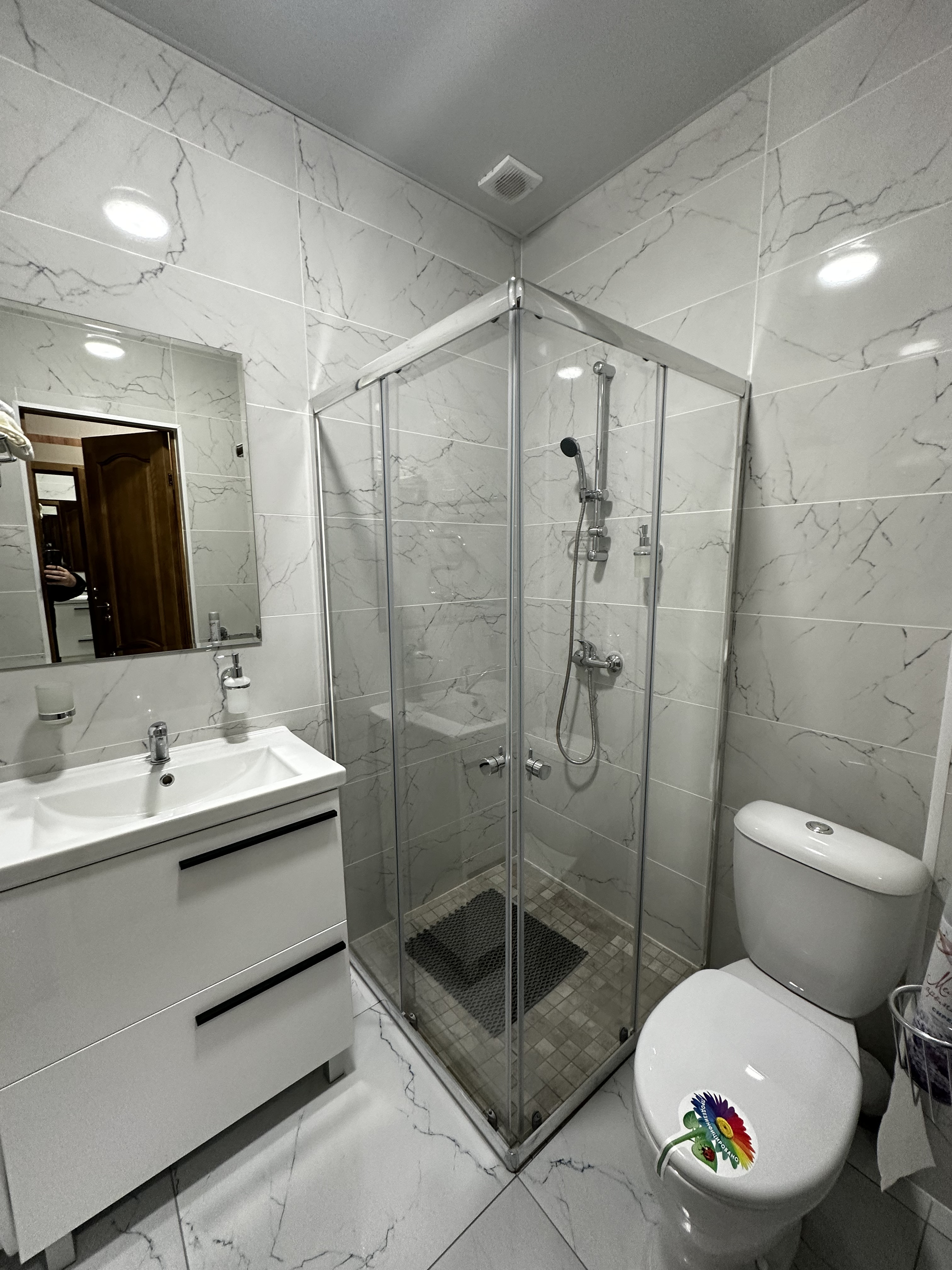 с душевой кабиной: ; тапочки: ; туалетные принадлежности: ; фен: ; халат: ;