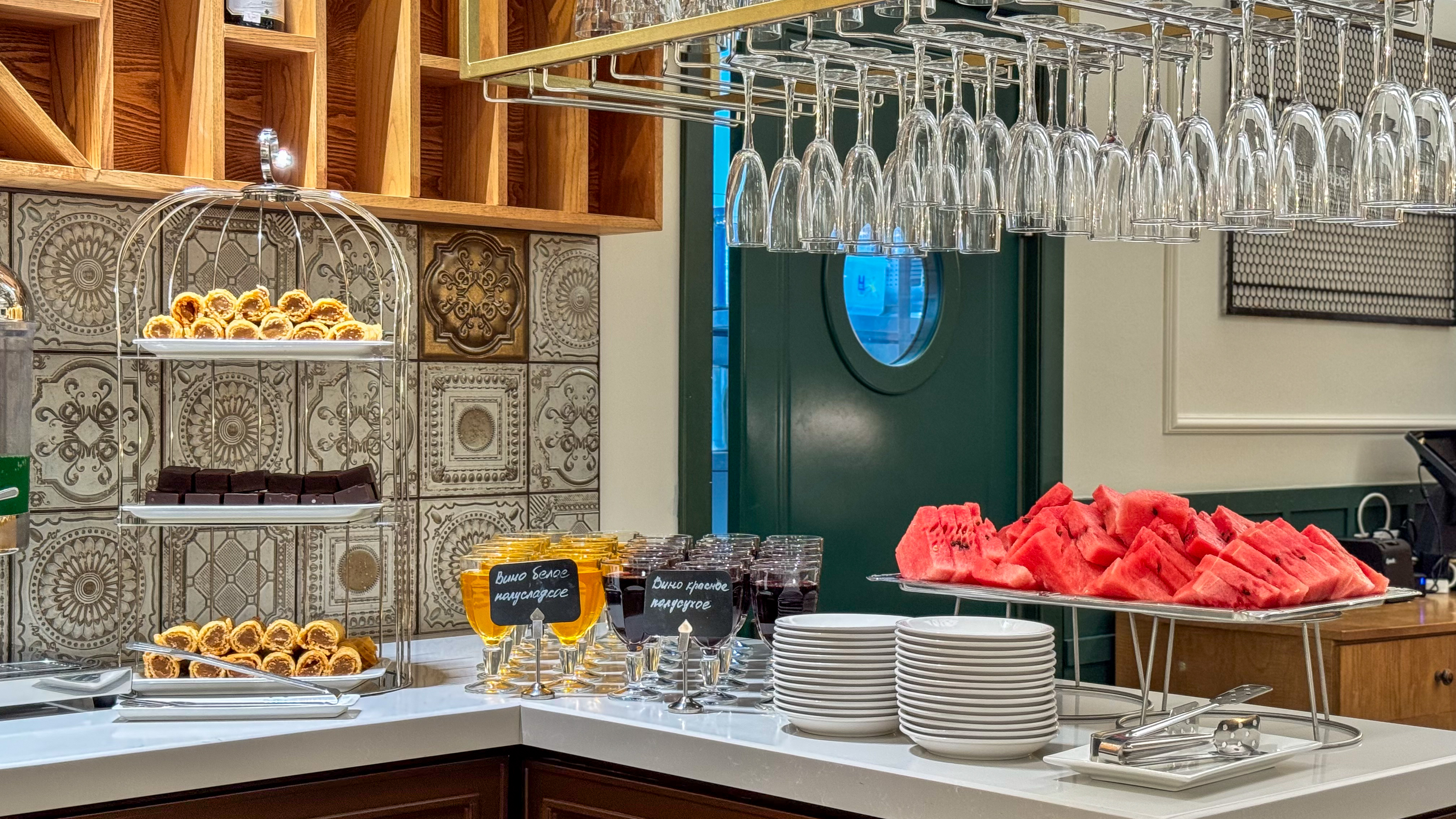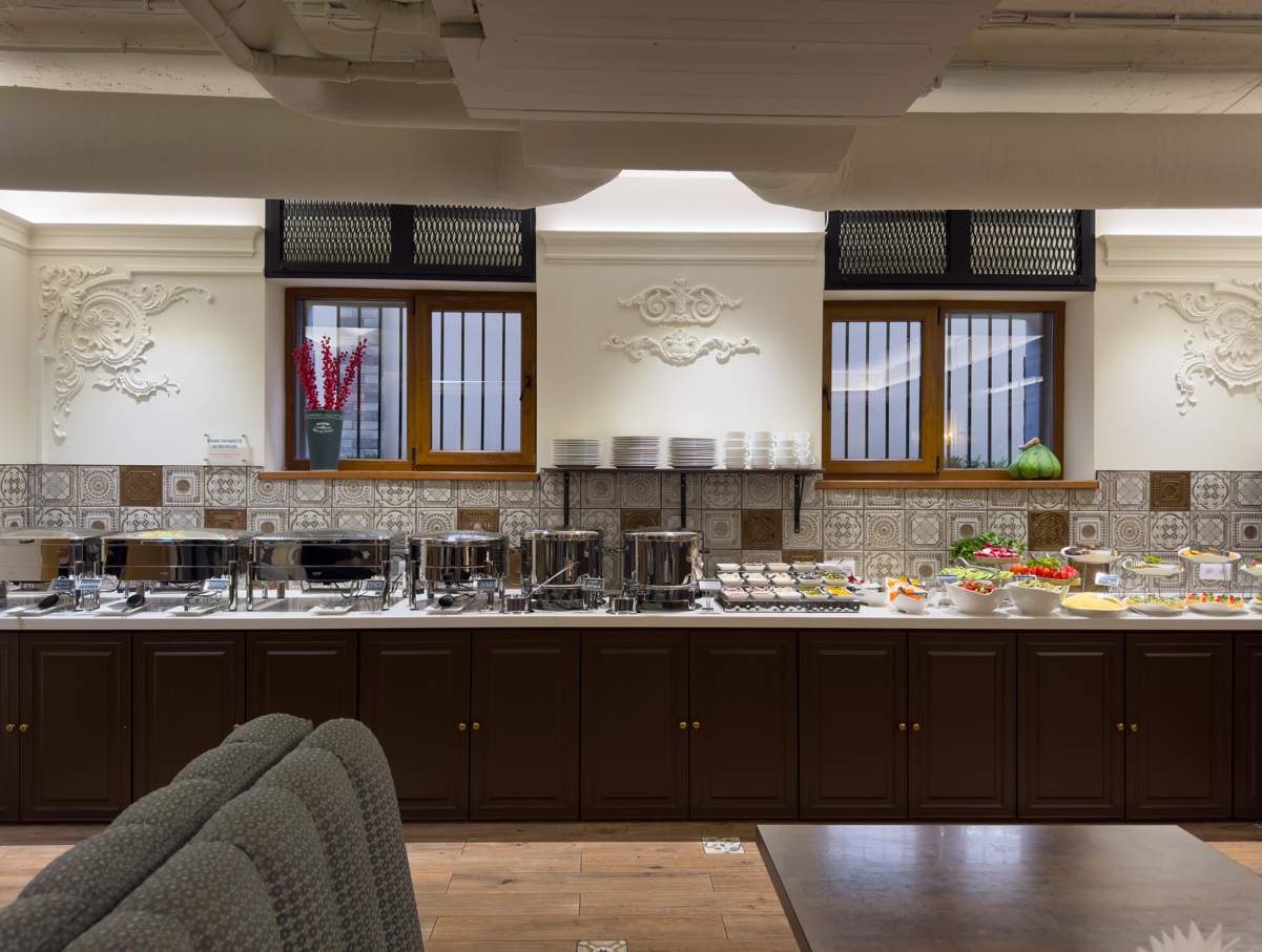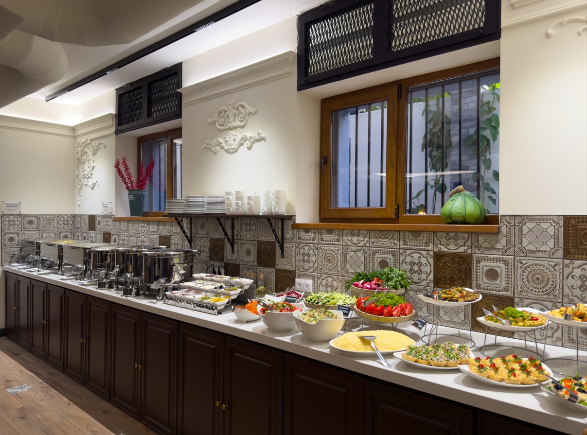 Позавтракать и поужинать по системе «шведский стол» можно в ресторане, расположенном в цокольном помещении отеля, а пообедать по сет-меню. Здесь, в уютной обстановке, можно насладиться вином и красивой живой музыкой.