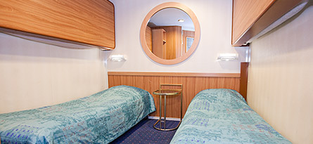 Уютная каюта с удобствами 11 м² без окна на 2−4 человека на палубах 5 и 9−11. В некоторых каютах кровати располагаются одна над другой. Нижние кровати можно объединить в двуспальную кровать. Каюты также для пассажиров, страдающих аллергией и для тех, у кого с собой маленькие домашние животные.