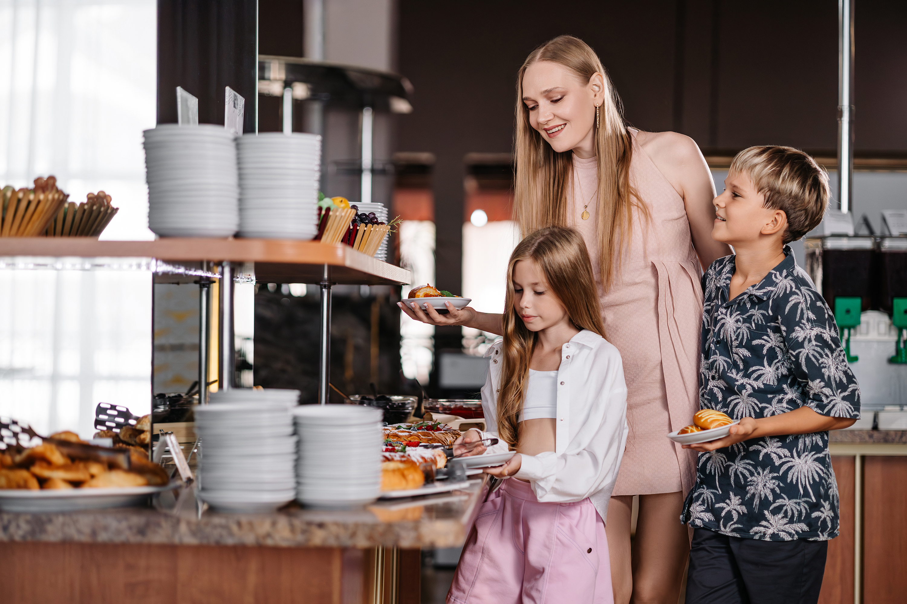 Отдельный детский зал на «шведской линии» со специальным детским меню: каши, супы-пюре, блюда на пару, овощные, мясные, рыбные блюда. Для детей до 3 лет: молочные смеси, пакетированная молочная и кисломолочная продукция. Детский буфет, детские столы и стульчики, стерилизатор, подогревающее устройство для бутылочек, микроволновая печь, блендер