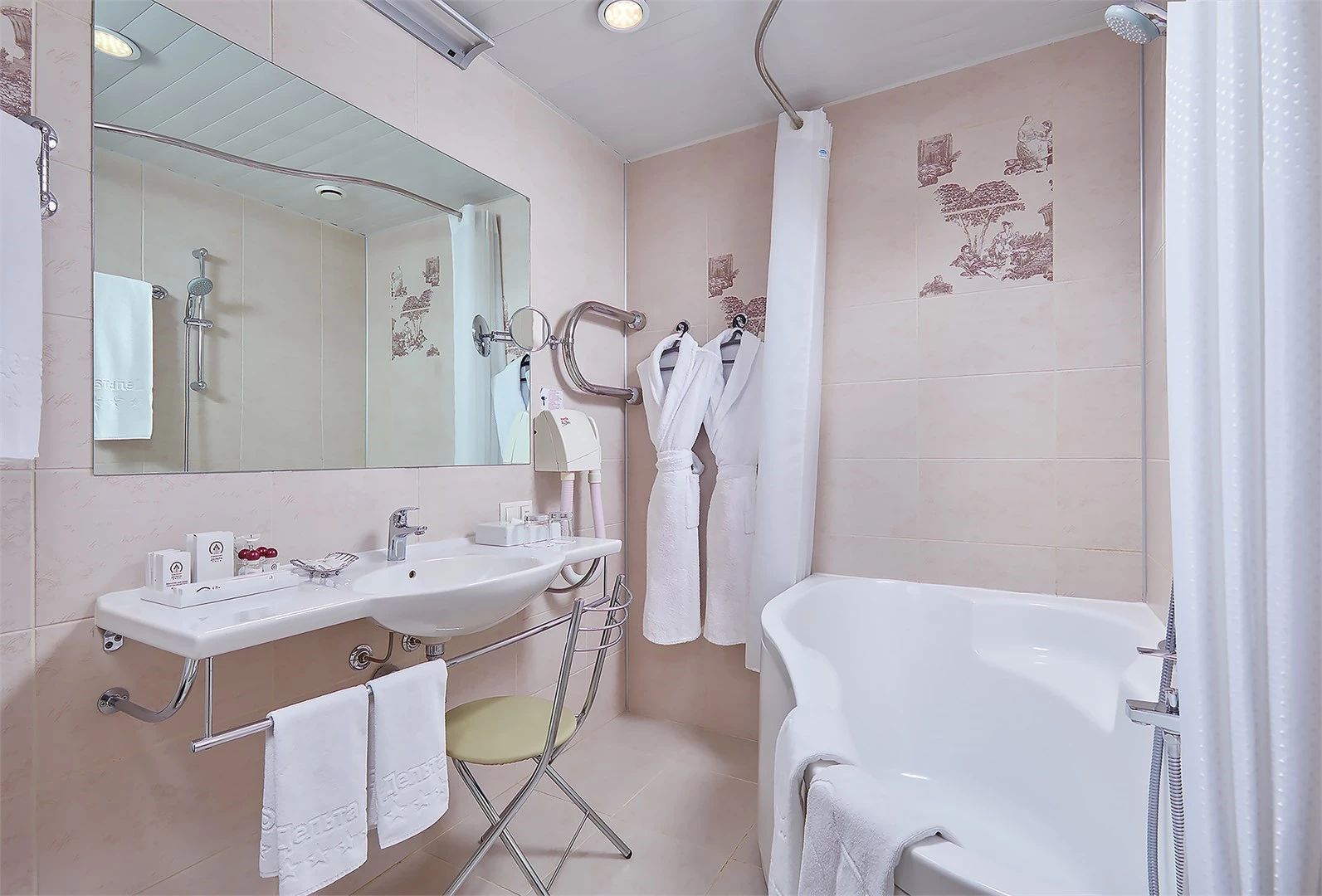 с ванной: ; тапочки: ; туалетные принадлежности: ; фен: ; халат: ;